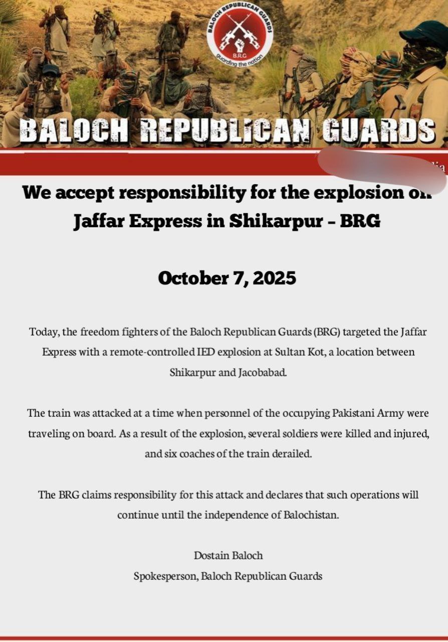बलूच रिपब्लिकन गार्ड्स ने अपने बयान में कहा, 'हम शिकारपुर बीआरजी में जाफर एक्सप्रेस पर हुए विस्फोट की जिम्मेदारी लेते हैं। आज बलूच रिपब्लिकन गार्ड्स के स्वतंत्रता सेनानियों ने शिकारपुर और जैकोबाबाद के बीच स्थित सुल्तान कोट में रिमोट-कंट्रोल IED विस्फोट के साथ जाफर एक्सप्रेस को निशाना बनाया। ट्रेन पर उस समय हमला किया गया जब कब्जा करने वाली पाकिस्तानी सेना के जवान उसमें यात्रा कर रहे थे। विस्फोट के कारण कई सैनिक मारे गए और घायल हो गए। इस धमाके से ट्रेन के छह डिब्बे पटरी से उतर गए।'
