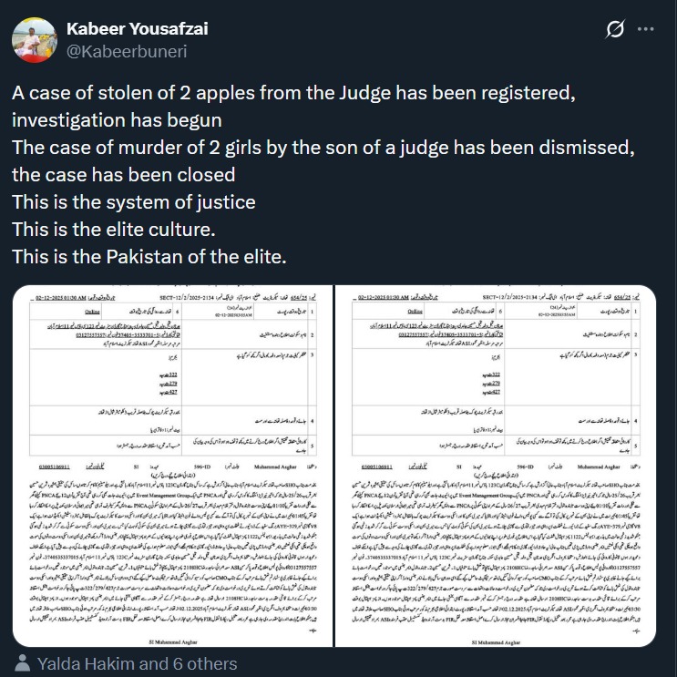 एक यूजर ने लिखा, 'जज के चैंबर से 2 सेब चोरी होने का केस दर्ज हो गया है। जांच शुरू हो गई है। दो लड़कियों की हत्या का केस खारिज कर दिया गया है। केस बंद हो गया है। यह इंसाफ का सिस्टम है। यह एलीट कल्चर है। यह एलीट लोगों का पाकिस्तान है।'