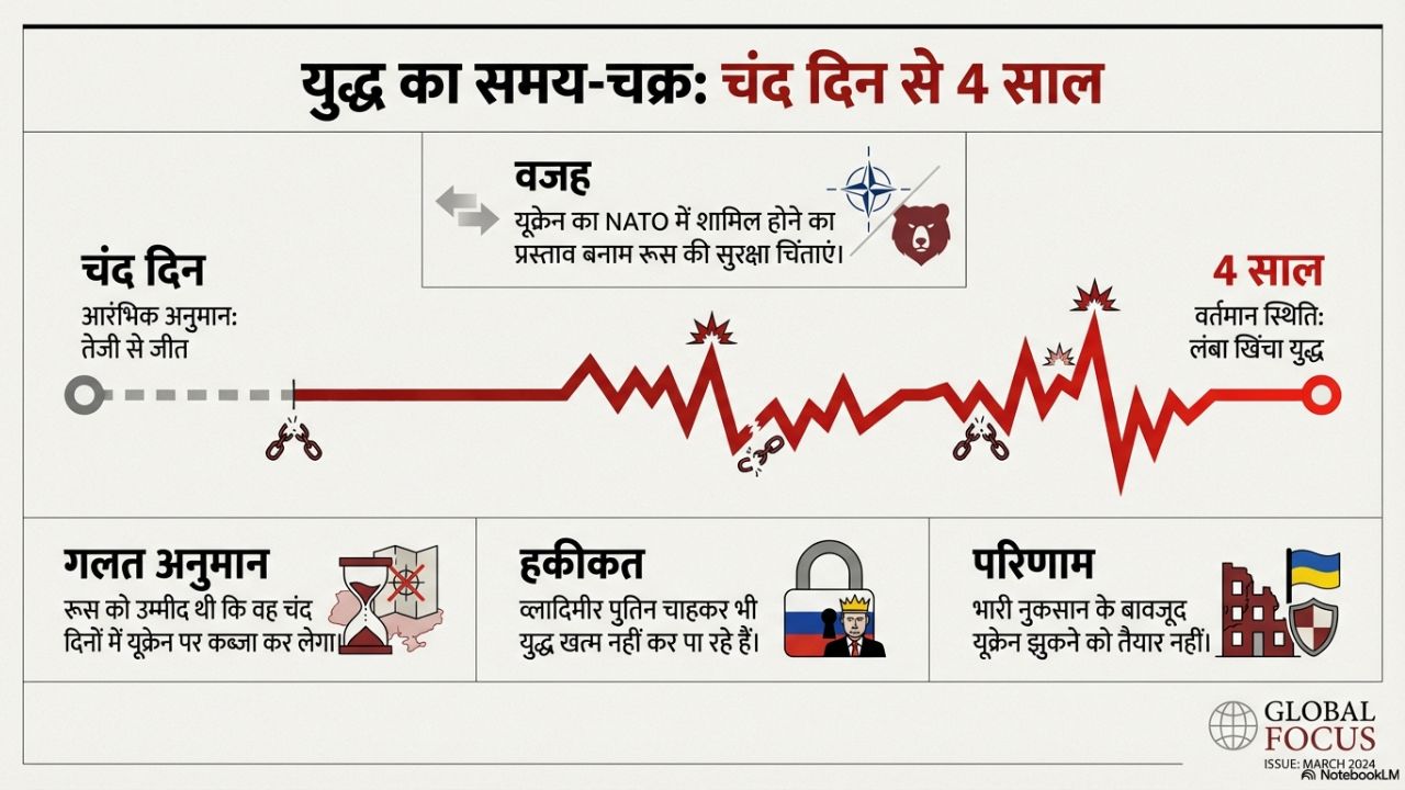 जब रूस ने यूक्रेन पर हमला किया था तब उसका कहना था कि 2 हफ्ते में वह जीत हासिल कर लेगा। अब 4 साल बीत चुके हैं लेकिन आज भी दोनों देशों का युद्ध जारी है।