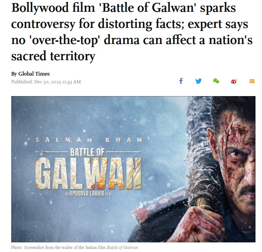 सलमान खान की आने वाली फिल्म 'बैटल ऑफ गलवान' को लेकर विवाद खड़ा हो गया है। यह फिल्म जून 2020 में गलवान घाटी में भारतीय और चीनी सैनिकों के बीच झड़प पर आधारित है। सलमान खान ने इस फिल्म का टीजर 26 दिसंबर को रिलीज किया था। यह फिल्म अप्रैल 2026 में रिलीज होने वाली है। इसे लेकर अब चीन के सरकारी अखबार 'ग्लोबल टाइम्स' ने एक लंबा-चौड़ा लेख लिखा है। इस लेख में ग्लोबल टाइम्स ने तथ्यों से छेड़छाड़ करने का आरोप लगाया है।