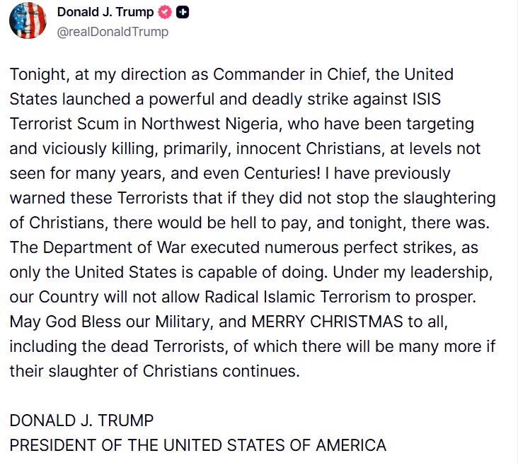 ट्रंप ने अपने सोशल मीडिया प्लेटफॉर्म ट्रुथ सोशल में लिखा, 'आज रात मेरे निर्देश पर अमेरिका ने उत्तर-पश्चिमी नाइजीरिया में ISIS आतंकियों के खिलाफ एक शक्तिशाली और घातक हमला किया, जो मासूम ईसाइयों को निशाना बना रहे थे और बेरहमी से मार रहे थे।'