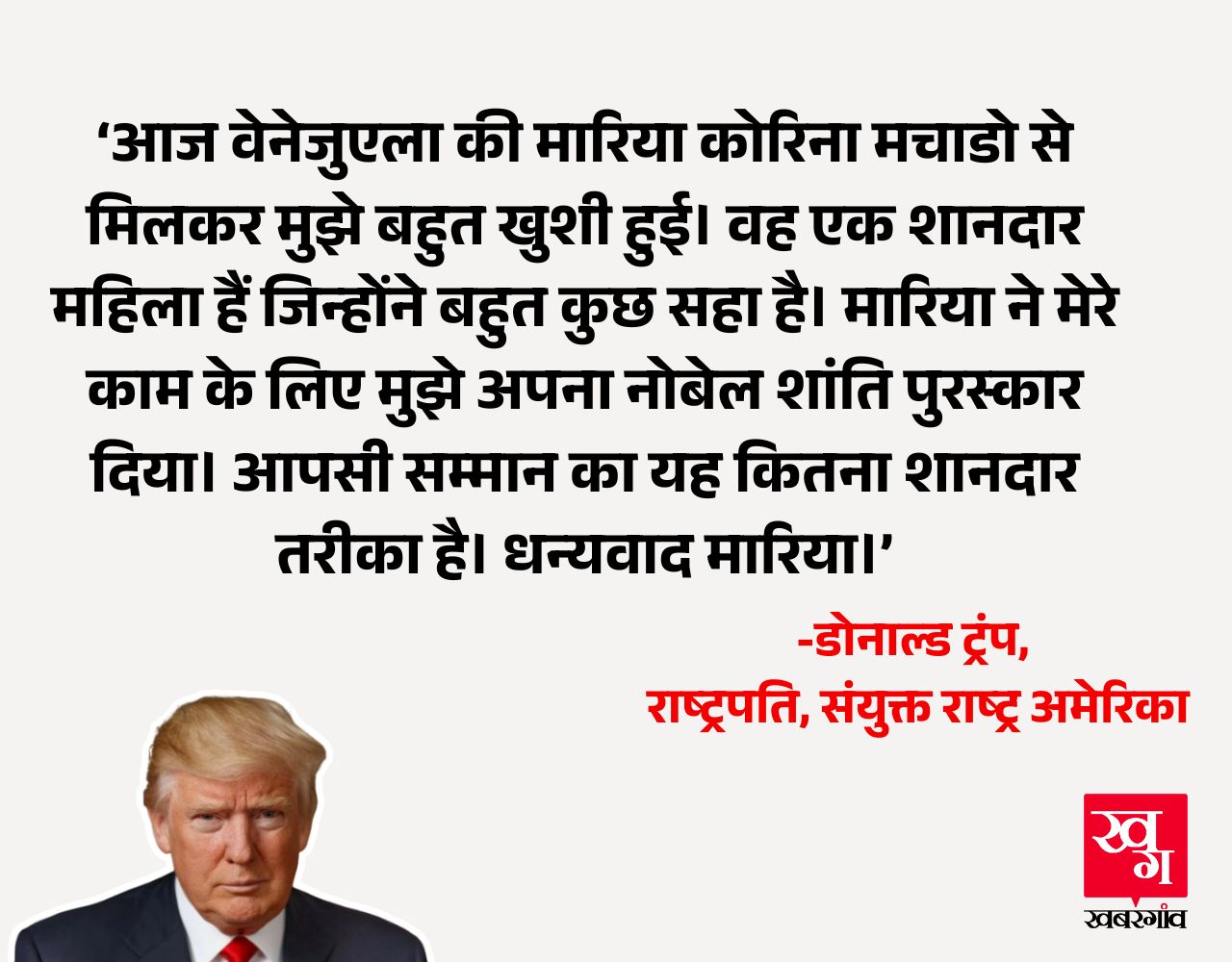 मारिया कोरिना मचाडो से मुलाकात के बाद डोनाल्ड ट्रंप ने लिखा, 'आज वेनेजुएला की मारिया कोरिना मचाडो से मिलकर मुझे बहुत खुशी हुई। वह एक शानदार महिला हैं जिन्होंने बहुत कुछ सहा है। मारिया ने मेरे काम के लिए मुझे अपना नोबेल शांति पुरस्कार दिया। आपसी सम्मान का यह कितना शानदार तरीका है।'
