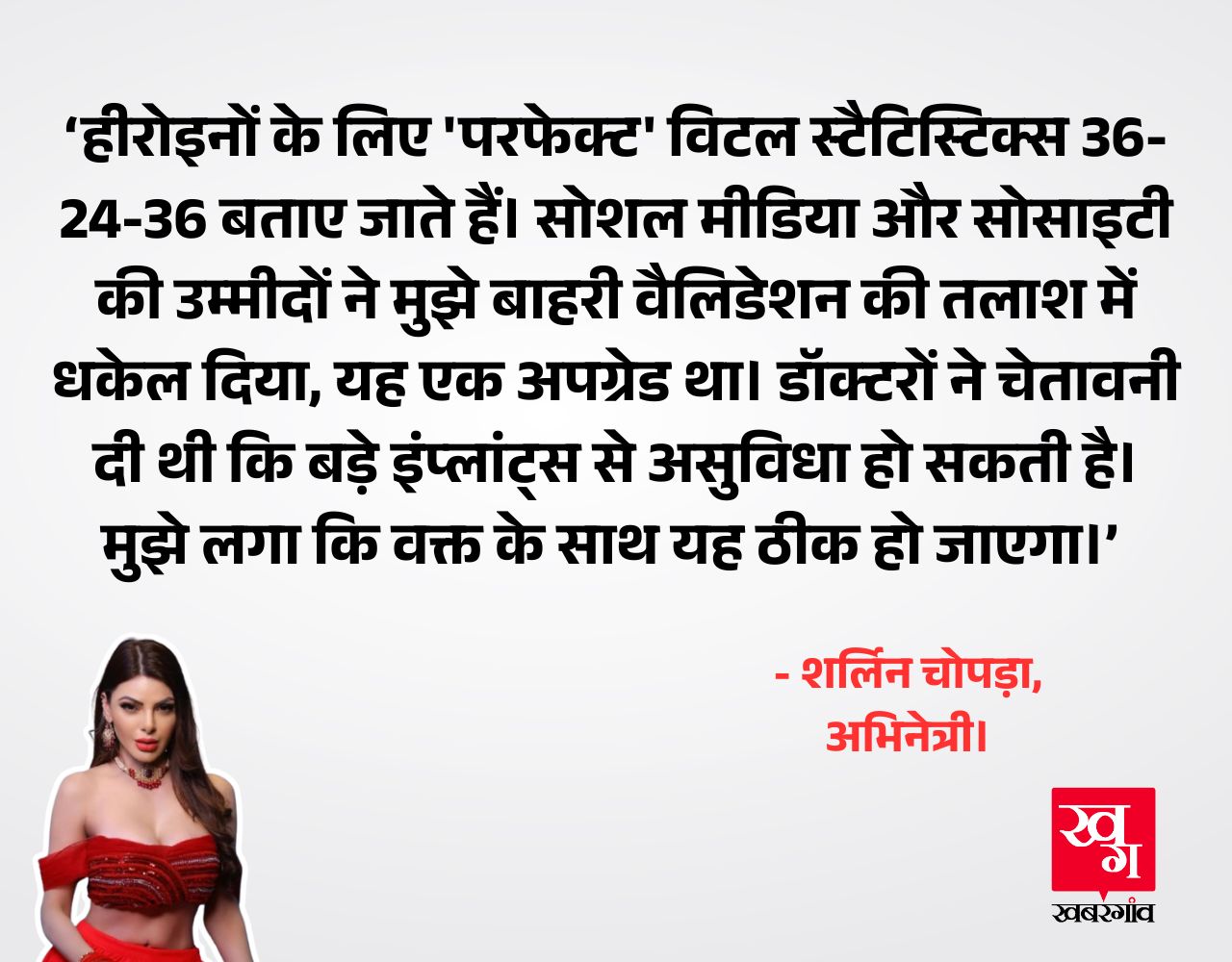 शर्लिन चोपड़ा अपने इंप्लांट्स को लेकर मुखर रहीं हैं। उन्होंने कहा था कि बॉलीवुड इंडस्ट्री के दबाव और कंडीशनिंग की वजह से उन्होंने इंप्लांट कराए थे। शर्लिन चोपड़ा ने साल 2021 में इंप्लांट कराया था। उन्होंने कहा था, 'हीरोइनों के लिए 'परफेक्ट' वाइटल स्टैटिस्टिक्स 36-24-36 बताए जाते हैं। सोशल मीडिया और सोसायटी की उम्मीदों ने मुझे बाहरी वैलिडेशन की तलाश में धकेल दिया, यह एक अपग्रेड था। डॉक्टरों ने चेतावनी दी थी कि बड़े इंप्लांट्स से असुविधा हो सकती है। मुझे लगा कि वक्त के साथ यह ठीक हो जाएगा।'