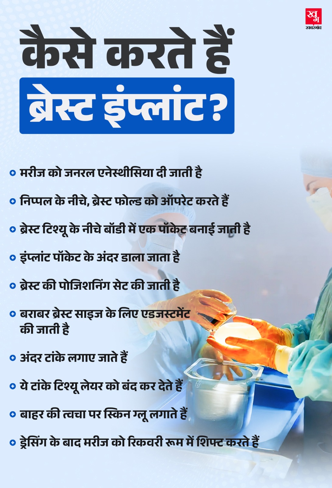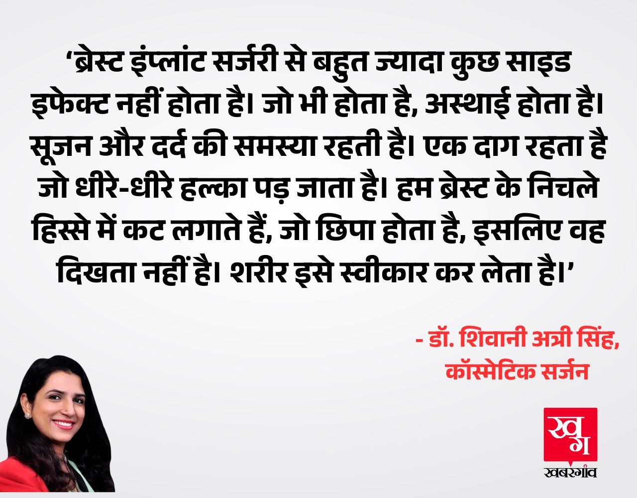 डॉक्टर प्रीति यादव, कॉस्मेटिक सर्जन हैं। उन्होंने कहा, 'ब्रेस्ट इम्प्लांट के बाद ब्रेस्ट के आकार और संवेदना में भी बदलाव आ सकते हैं। डॉक्टरों का मानना है कि इस सर्जरी से पहले संभावित नुकसान को जानना चाहिए। डॉक्टर से खुलकर सलाह-मशविरा करने के बाद ही इंप्लांट के लिए आगे बढ़ना चाहिए। ब्रेस्ट इम्प्लांट के बाद रिकवरी टाइमिंग, सावधानियां, और मरीज को होने वाले फिजिकल और मेंटल बदलावों की जानकारी बेहद जरूरी है। हर महिला या ट्रांस पर्सन के लिए सर्जरी का असर अलग हो सकता है।'