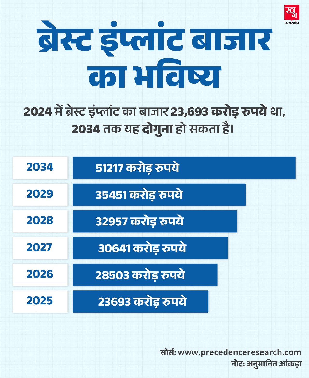 प्रेसिडेंस रिसर्च precedenceresearch.com की एक रिपोर्ट में अनुमान जताया गया है कि दुनियाभर में ब्रेस्ट इंप्लांट्स का बाजार और बड़ा हो सकता है। साल 2024 में इसका बाजार करीब 23693 करोड़ रुपये का था। 2025 में ब्रेस्ट इंप्लांट का बाजार करीब 26,629 करोड़ रुपये से ज्यादा तक पहुंच सकता है। साल 2034 तक यह बाजार करीब 51217 करोड़ रुपये से ज्यादा हो सकता है। दुनिया में कॉस्मेटिक सर्जरी की मांग तेजी से बढ़ गई है। महिलाएं, परफेक्ट बॉडी शेप के हासिल करने के लिए ऐसा कर रही हैं।