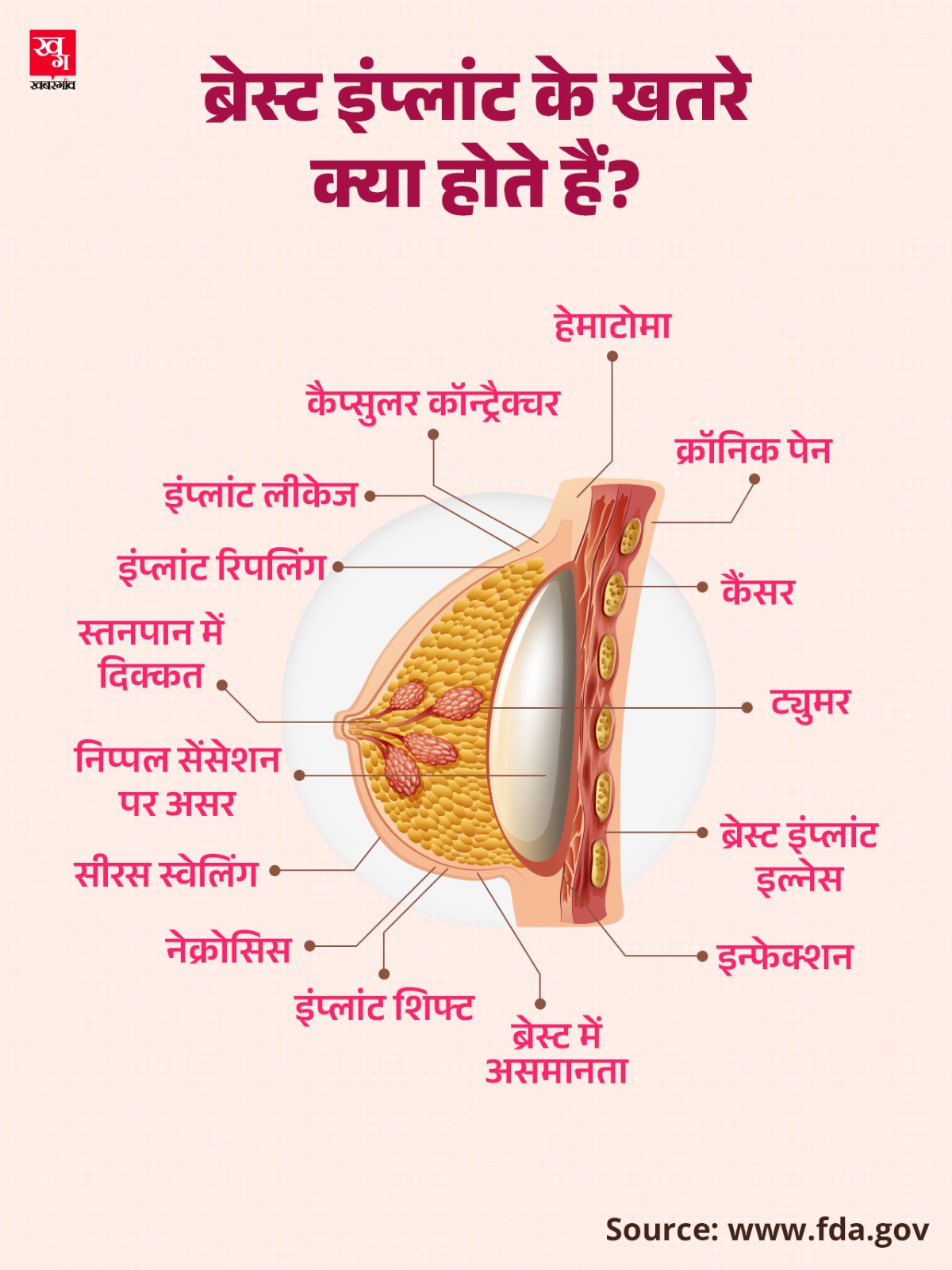 US फूड एंड ड्रग एडमिनिस्ट्रेशन ने दिसंबर 2023 में एक रिसर्च तैयार की थी। रिसर्च में कहा गया था, 'ब्रेस्ट इंप्लांट के तत्काल बाद निप्पल एरिया में सूजन और रेडनेस नजर आ सकती है। इंप्लांट के घिसने और फटने का खतरा हमेशा बना रहता है। निप्पल और स्तन की संवेदनशीलता में बदलाव आता है। इम्प्लांट को कवर करने वाले टिश्यू सख्त हो जाते हैं। ब्रेस्ट इम्प्लांट की वजह से ब्रेस्ट एसोसिएटेड एनाप्लास्टिक लार्ज सेल लिम्फोमा भी हो सकता है, यह एक दुर्लभ कैंसर है। कुछ मरीजों में ब्रेस्ट इम्प्लांट के बाद बैक पेन, मांसपेशियों में खिंचाव और जोड़ों का दर्द उभरता है। मरीजों को हमेशा ऐसा फील होता है कि सीने पर कुछ रखा है।'