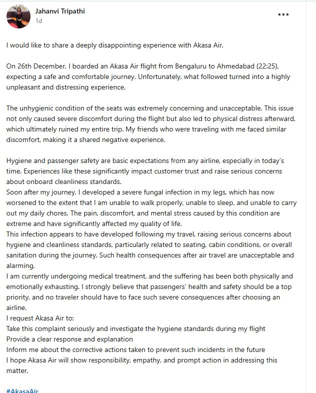 जाह्नवी त्रिपाठी नाम की महिला ने अपने लिंक्डइन पोस्ट में लिखा, मैं अकासा एयर के साथ अपने एक बहुत ही निराशाजनक अनुभव के बारे में बताना चाहता हूं। 26 दिसंबर को मैंने बेंगलुरु से अहमदाबाद (22:25) के लिए अकासा एयर की फ्लाइट पकड़ी। उम्मीद थी कि यात्रा सुरक्षित और आरामदायक होगी। दुर्भाग्य से इसके बाद जो हुआ, वह एक बहुत ही अप्रिय और परेशान करने वाला अनुभव बना।'