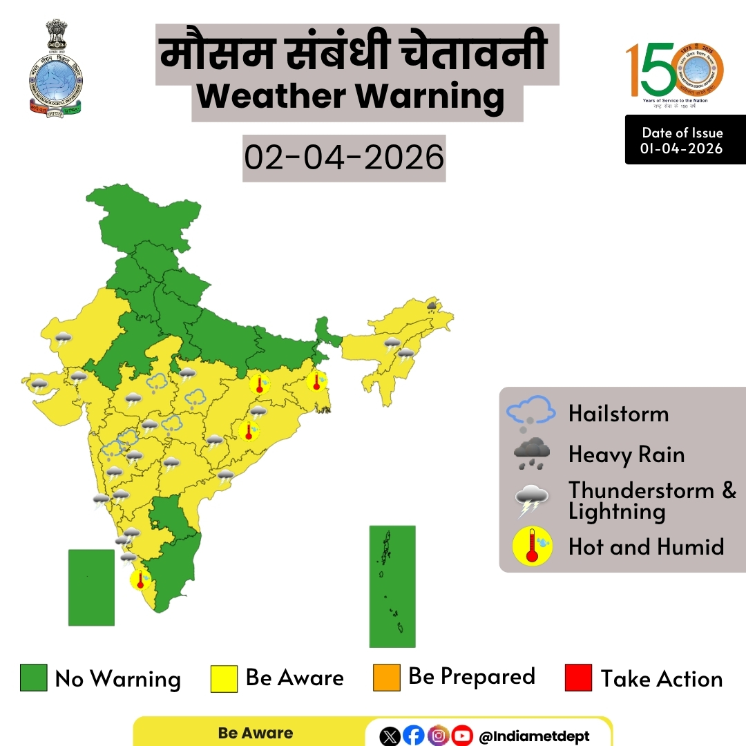 दक्षिण भारत की बात करें तो 5 अप्रैल तक तटीय आंध्र प्रदेश, तेलंगाना और आंतरिक कर्नाटक में हल्की से मध्यम बारिश के साथ गरज-चमक और तेज हवाओं का अलर्ट जारी किया गया है। केरल में 5 अप्रैल तक बारिश का असर रहेगा। इसके साथ ही तमिलनाडु, पुडुचेरी और तटीय कर्नाटक में आज मौसम खराब रहने और बिजली गिरने की आशंका है। इसके साथ ही दक्षिण भारत में तापमान भी बढ़ रहा है और उमस भरा मौसम लोगों को परेशान कर रहा है।