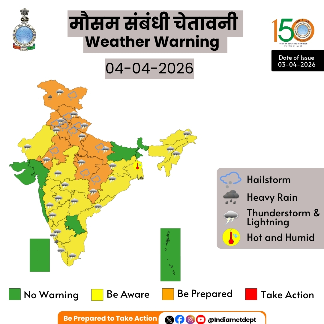 अगर आप इस वीकेंड बाहर जाने का प्लान बना रहे हैं तो इससे पहले एक बार मौसम का पूर्वानुमान जरूर जान लीजिए। पिछले 24 घंटे की बात करें तो देशभर में पिछले 24 घंटे में बारिश, ओले और तेज हवाएं देखने को मिली हैं। उत्तर भारत से दक्षिण और मध्य और पूर्वी-पूर्वोत्तर भारत में मौसम खराब रहा। बेमौसम बारिश से किसान परेशान हैं और फसलों की कटाई से लेकर मंडी तक पहुंचाने में मुश्किलें आ रही हैं। मौसम विभाग के पूर्वानुमान के अनुसार, आज भी देश के कई राज्यों में बारिश होने की संभावना है। मौसम विभाग ने बताया है कि दो पश्चिमी विक्षोभ सक्रिय रह सकते हैं और उनका सबसे ज्यादा असर 4 अप्रैल यानी आज देखने को मिलेगा।