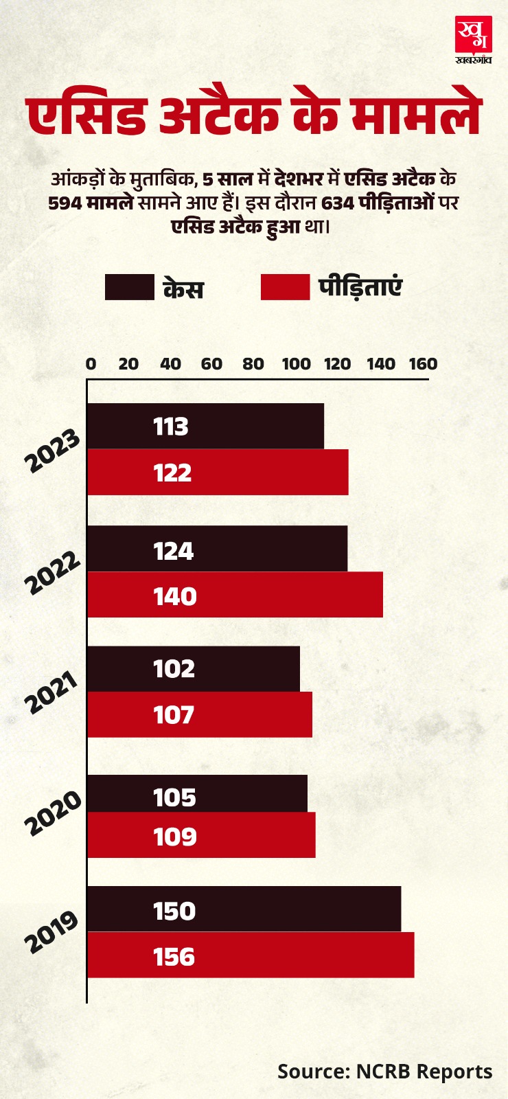 आंकड़े बताते हैं कि अब भी भारत में हर एसिड अटैक के सैकड़ों मामले सामने आते हैं। नेशनल क्राइम रिकॉर्ड ब्यूरो (NCRB) के आंकड़ों के मुताबिक, 2019 से 2023 के बीच पांच साल में देशभर में एसिड अटैक के 594 मामले दर्ज किए गए हैं। इन मामलों में 634 पीड़िताओं को निशाना बनाया गया था।