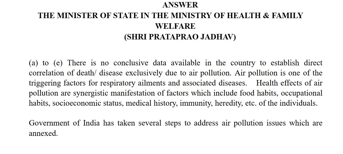 जवाब देते हुए स्वास्थ्य राज्य मंत्री प्रतापराव जाधव ने कहा, 'देश में ऐसा कोई पक्का डेटा उपलब्ध नहीं है जो सिर्फ वायु प्रदूषण की वजह से होने वाली मौत या बीमारी का सीधा संबंध स्थापित कर सके। वायु प्रदूषण सांस और इससे जुड़ी बीमारियों के लिए ट्रिगर करने वाले कारकों में से एक है।'