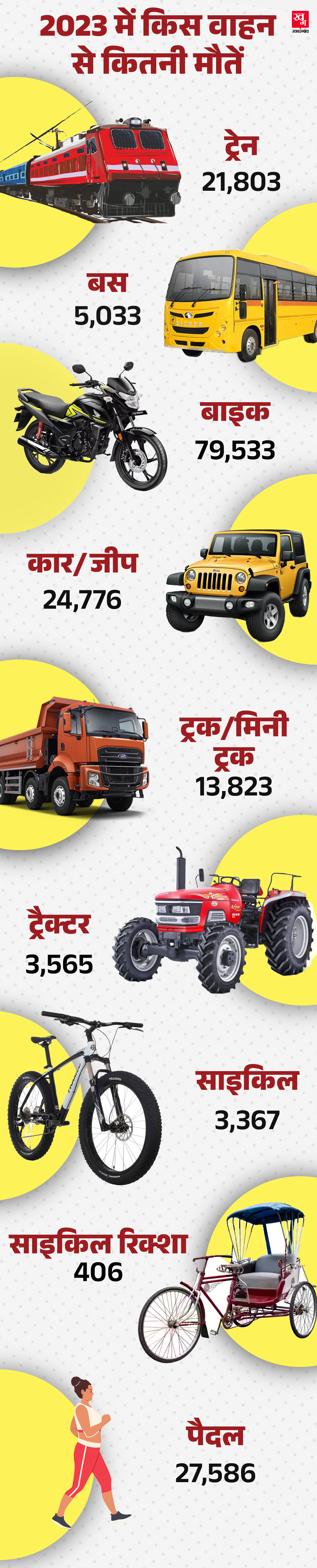 दोपहिया वाहन से सबसे अधिक मौतें: बाइक का सफर सुहाना है, लेकिन सुरक्षित नहीं। 2023 में सबसे अधिक मौतें बाइक हादसों में हुई हैं। कुल 79,533 लोगों ने अपनी जान गंवाई। 2.10 लाख लोग घायल हुए। ट्रेन हादसों में मरने वालों की तुलना बाइक से जान गंवाने वाले लोगों की संख्या तीन गुना से भी ज्यादा है। सड़क हादसों में जान गंवाने वाला हर दूसरा व्यक्ति बाइक सवार था।