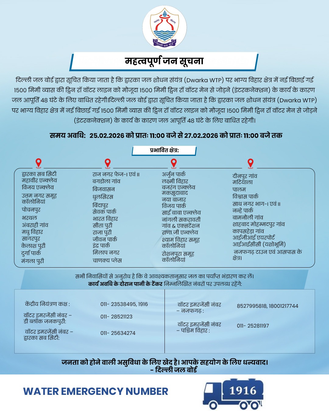 दिल्ली जल बोर्ड ने अपने एक्स अकाउंट पर पोस्ट कर इस रुकावट के बारे में जानकारी दी। जल बोर्ड ने के अनुसार, 25 फरवरी सुबह 11 बजे से 27 फरवरी सुबह 11 बजे तक पानी की सप्लाई बंद रहेगी। पोस्ट में लिखा, 'भाग्य विहार में द्वारका WTP की मौजूदा 1500mm डायमीटर वाली ट्विन रॉ वॉटर मेन लाइन को अलग करने के लिए नई बिछाई गई 1500mm डायमीटर वाली ट्विन रॉ वॉटर लाइन के इंटरकनेक्शन के काम की वजह से, 25 फरवरी को सुबह 11 बजे से 27 फरवरी को सुबह 11 बजे तक 48 घंटे के लिए पानी की सप्लाई नहीं मिलेगी।'