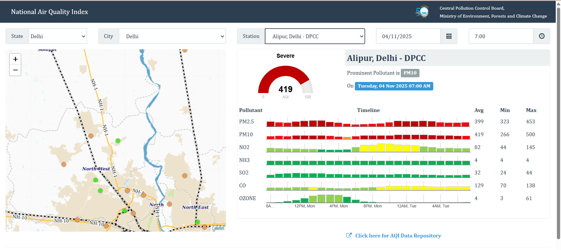 केंद्रीय प्रदूषण नियंत्रण बोर्ड (CPCB) के अनुसार, मंगलवार सुबह 7 बजे अलीपुर दिल्ली स्टेशन में एयर क्वालिटी इंडेक्स (AQI) 419 दर्ज किया गया। AQI अगर 400 पार कर जाता है तो इसे गंभीर कैटेगरी में माना जाता है और दिल्ली के कई ज्यादातर इलाकों में AQI 400 के आसपास बना हुआ है। दिल्ली में प्रदूषण के बढ़ते स्तर ने दिल्ली वालों की चिंता बढ़ा दी है।