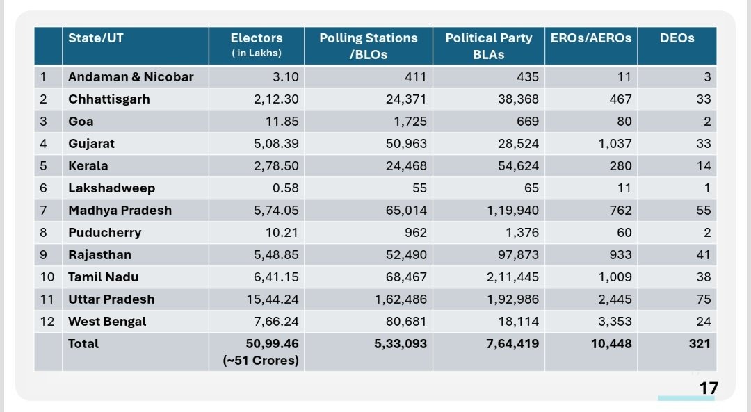 अब दूसरे चरण में 9 राज्य- उत्तर प्रदेश, पश्चिम बंगाल, राजस्थान, मध्य प्रदेश, केरल, गुजरात, गोवा, छत्तीसगढ़ और तमिलनाडु में SIR होगा। इनके अलावा तीन केंद्र शासित प्रदेश- अंडमान-निकोबार, लक्षद्वीप और पुडुचेरी में भी SIR किया जाएगा।