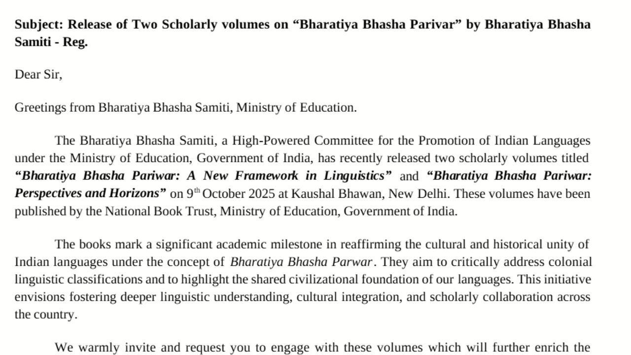 किताब में अगस्त्य ऋषि की कथा भी बताई गई है, जिन्हें तमिल व्याकरण का जनक माना जाता है। समिति का कहना है कि पुरानी भाषा के परिवार वाला वर्गीकरण, अंग्रेजों की सोच है, जिसमें भारत की एकता छिपाई गई है। उनका इशारा जैसे इंडो-आर्यन, द्रविड़, ऑस्ट्रो-एशियाटिक, तिब्बत-बर्मन वाली विचारधारा की है। 'भारतीय भाषा परिवार' में दावा किया गया है कि भारत की भाषाएं कुपवाड़ा से कन्याकुमारी तक एक ही सांस्कृतिक व्याकरण से बंधी हैं। अब बड़े-बड़े भाषाविदों ने इस पर कड़ी आपत्ति जताई है।