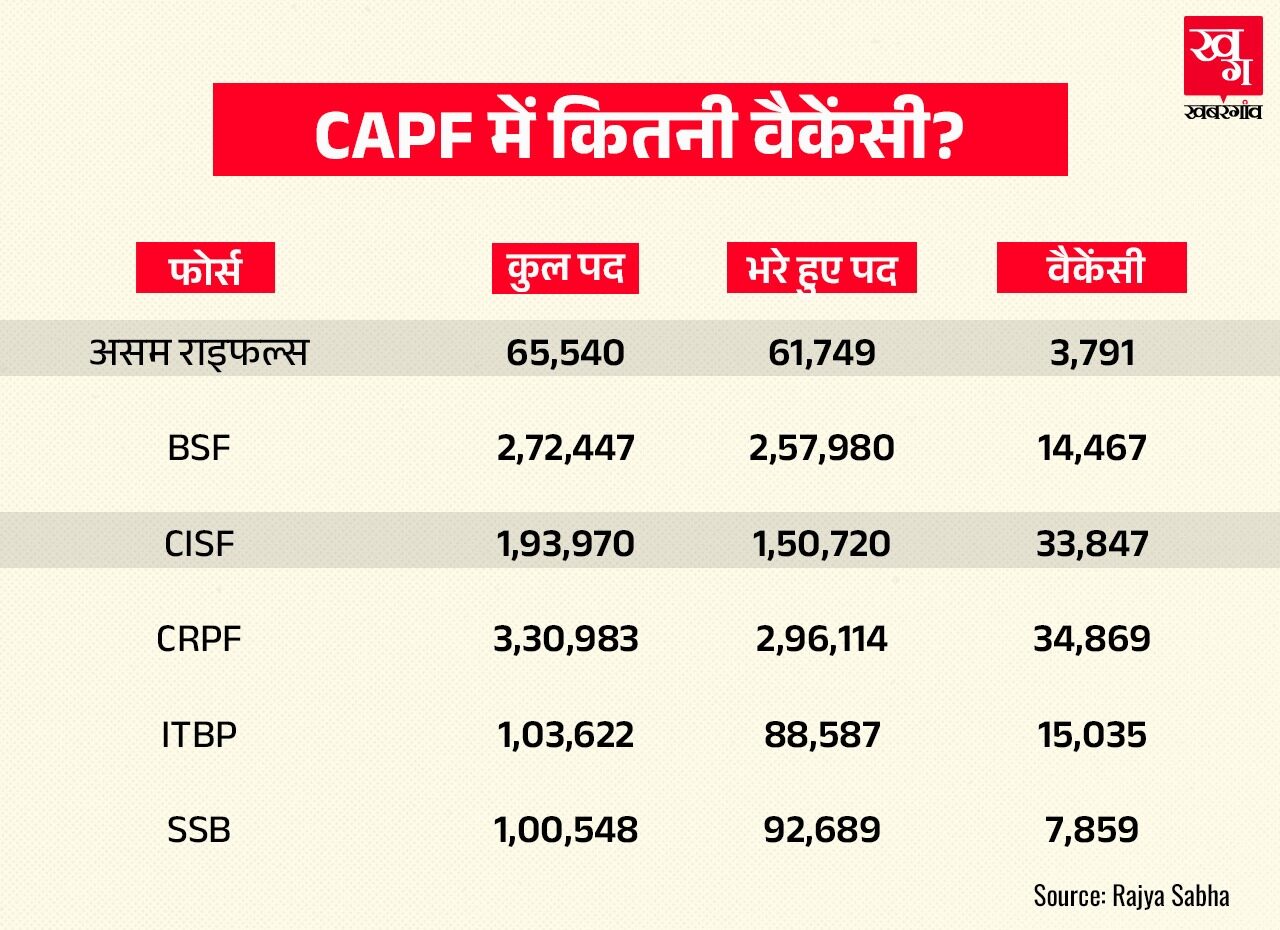 केंद्रीय मंत्री नित्यानंद राय ने बाताया कि 2025 तक असम राइफल्स में 3 हजार 791, BSF में 14 हजार 467, CISF में 33 हजार 847, CRPF में 34 हजार 869, ITBP में 15 हजार 35 और SSB में 7 हजार 859 पद खाली थे।