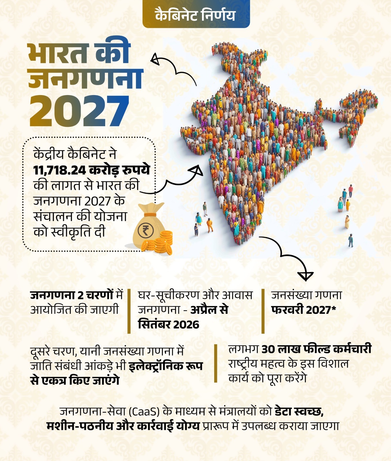 2027 की जनगणना के लिए मोदी कैबिनेट ने 11,718 करोड़ रुपये मंजूर किए हैं। जनगणना दो चरणों में होगी। इस बार की जनगणना दो मायनों में खास होगी।