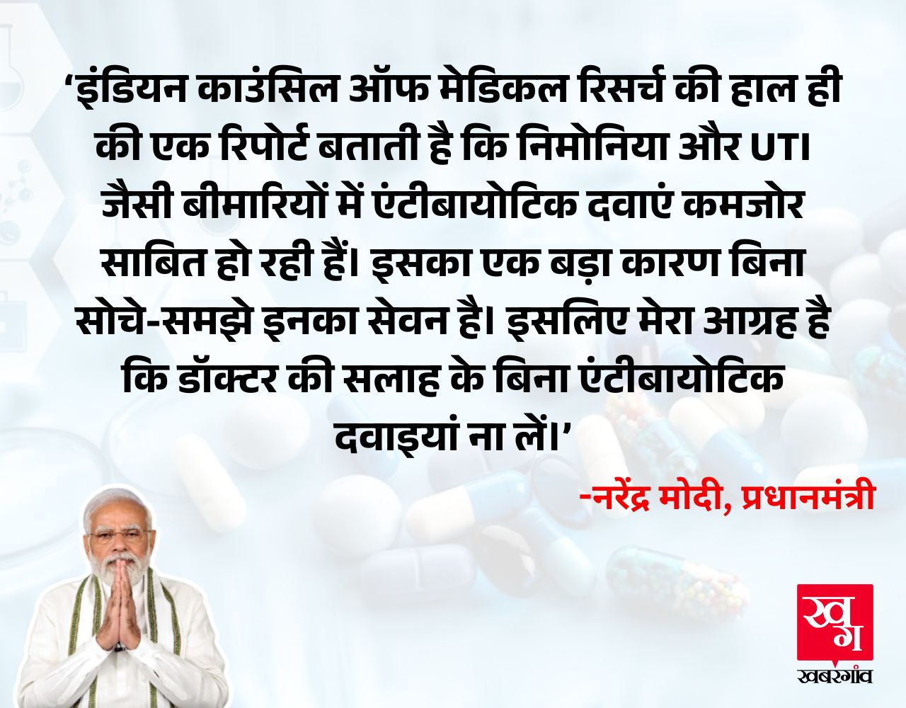 ICMR यानि इंडियन काउंसिल ऑफ मेडिकल रिसर्च की हाल ही की एक रिपोर्ट बताती है कि निमोनिया और UTI जैसी बीमारियों में एंटीबायोटिक दवाएं कमजोर साबित हो रही हैं। इसका एक बड़ा कारण बिना सोचे-समझे इनका सेवन है। इसलिए मेरा आग्रह है कि डॉक्टर की सलाह के बिना एंटीबायोटिक दवाएं ना लें।