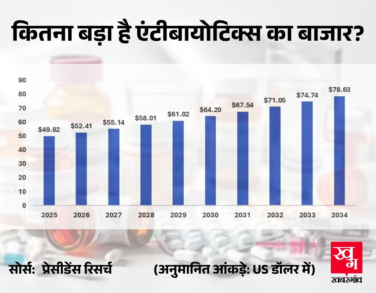 दुनिया भर में एंटीबायोटिक्स दवाओं का बाजार तेजी से बढ़ रहा है। 2025 में यह बाजार 49.82 अरब अमेरिकी डॉलर का है, जो 2026 में बढ़कर 52.41 अरब डॉलर हो सकता है। 2034 तक यह करीब 78.63 अरब डॉलर तक पहुंचने का अनुमान है। 2025 से 2034 तक यह हर साल औसतन 5.20% की दर से इसका बाजार बढ़ रहा है। साल 2024 में एशिया पैसिफिक इलाके में सबसे ज्यादा ग्रोथ देखी गई है। दुनियाभर की एंटीबायोटिक दवाइयों के बाजार का 46% हिस्सा यहीं से आता है, वहीं उत्तर अमेरिका और यूरोप मिलकर 48% हिस्से के बाजार पर अपनी दखल रखते हैं। पेनिसिलिन दवाएं सबसे लोकप्रिय हैं, जिनका बाजार, 27% से ज्यादा है। सेल वॉल फोटो सेंथेसिसि रोकने वाली दवाओं का हिस्सा 53 फीसदी है। बढ़ते संक्रमण, बुजुर्ग आबादी, अस्पताल में होने वाले इंफेक्शन और महामारी के असर से इन दवाओं की मांग बढ़ी है।