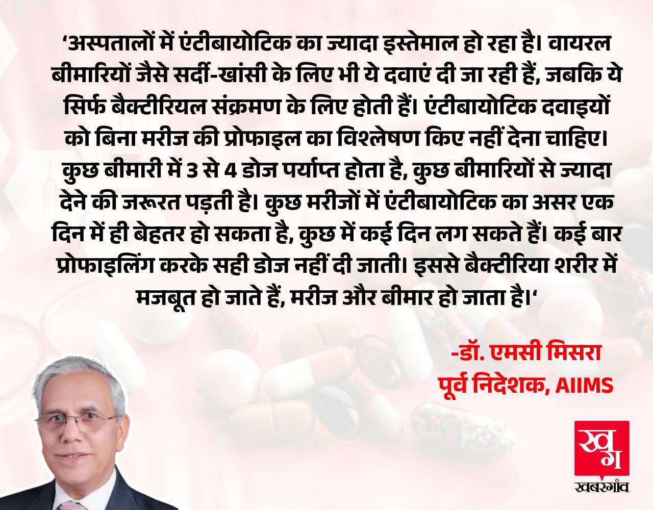 AIIMS के पूर्व निदेशक डॉ. एमसी मिसरा ने कहा, 'अस्पतालों में एंटीबायोटिक का ज्यादा इस्तेमाल हो रहा है। वायरल बीमारियों जैसे सर्दी-खांसी के लिए भी ये दवाएं दी जा रही हैं, जबकि ये सिर्फ बैक्टीरियल संक्रमण के लिए होती हैं। एंटीबायोटिक दवाइयों को बिना मरीज की प्रोफाइल का विश्लेषण किए नहीं देना चाहिए। कुछ बीमारी में 3 से 4 डोज पर्याप्त होता है, कुछ बीमारियों से ज्यादा देने की जरूरत पड़ती है। कुछ मरीजों में एंटीबायोटिक का असर एक दिन में ही बेहतर हो सकता है, कुछ में कई दिन लग सकते हैं। कई बार प्रोफाइलिंग करके सही डोज नहीं दी जाती। इससे बैक्टीरिया शरीर में मजबूत हो जाते हैं, मरीज और बीमार हो जाता है।'