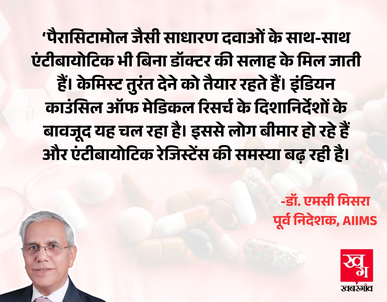 डॉ. एमसी मिसरा ने एक चिंता यह भी जताई कि फार्मेसी में बिना प्रिस्क्रिप्शन के दवाइयां देने का चलन बढ़ा है। अगर दवाई निश्चेतक नहीं है तो आमतौर पर केमिस्ट बिना कुछ सवाल-जवाब के दे देते हैं। लोग मनमाने ढंग से दवा खाते हैं और बीमार होते हैं। पैरासिटामोल जैसी साधारण दवाओं के साथ-साथ एंटीबायोटिक भी बिना डॉक्टर की सलाह के मिल जाती हैं। केमिस्ट तुरंत देने को तैयार रहते हैं। इंडियन काउंसिल ऑफ मेडिकल रिसर्च के दिशानिर्देशों के बावजूद यह चल रहा है। इससे लोगों में बीमारी फैल रही है और एंटीबायोटिक रेजिस्टेंस की समस्या बढ़ रही है।