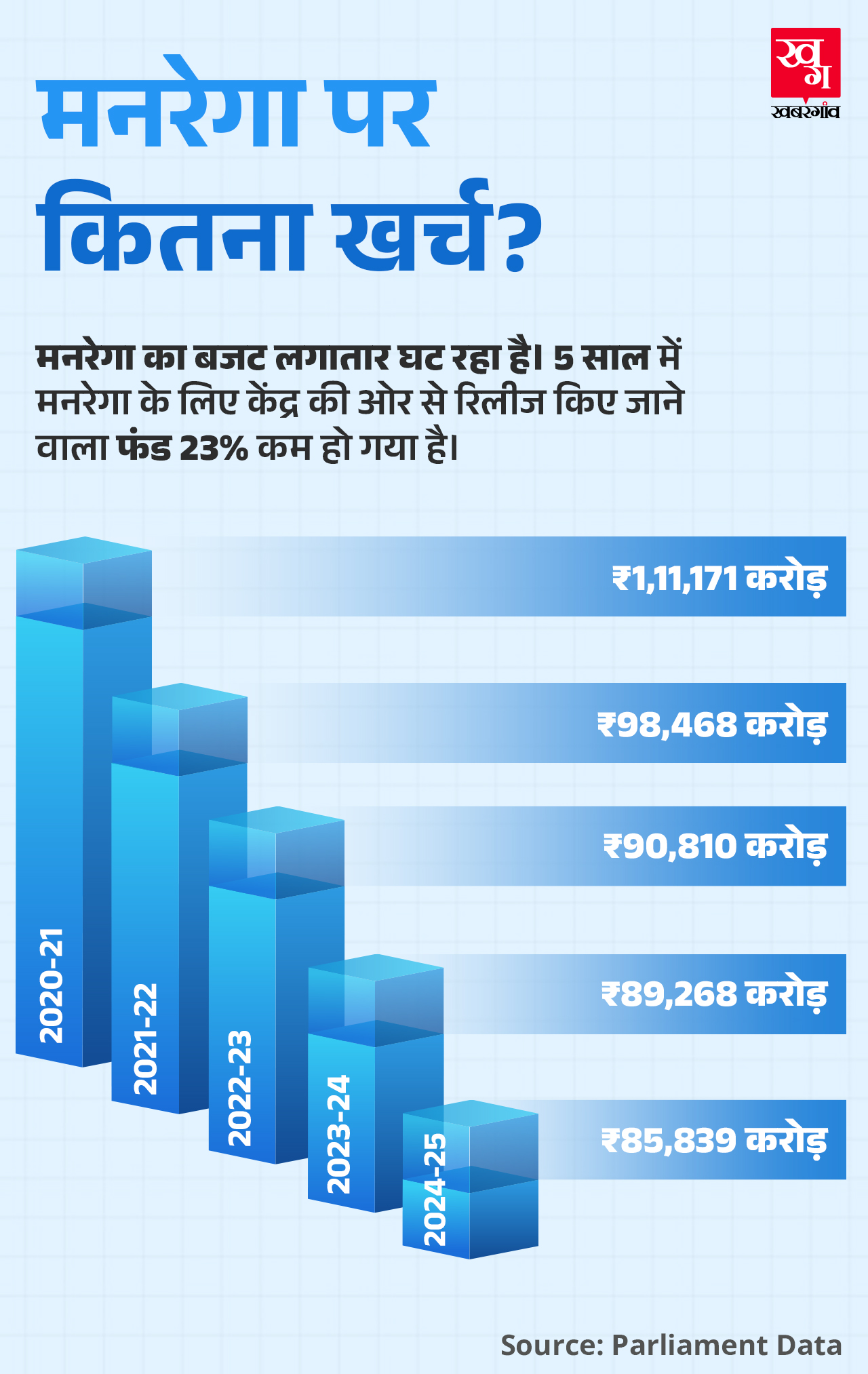 डेटा बताता है कि 5 साल में मनरेगा के लिए केंद्र की ओर से रिलीज होने वाला फंड 23 फीसदी तक कम हो गया है। 2020-21 में केंद्र ने जहां 1.11 लाख करोड़ रुपये का फंड दिया था, वही 2024-25 में 86 हजार करोड़ रुपये से भी कम हो गया।