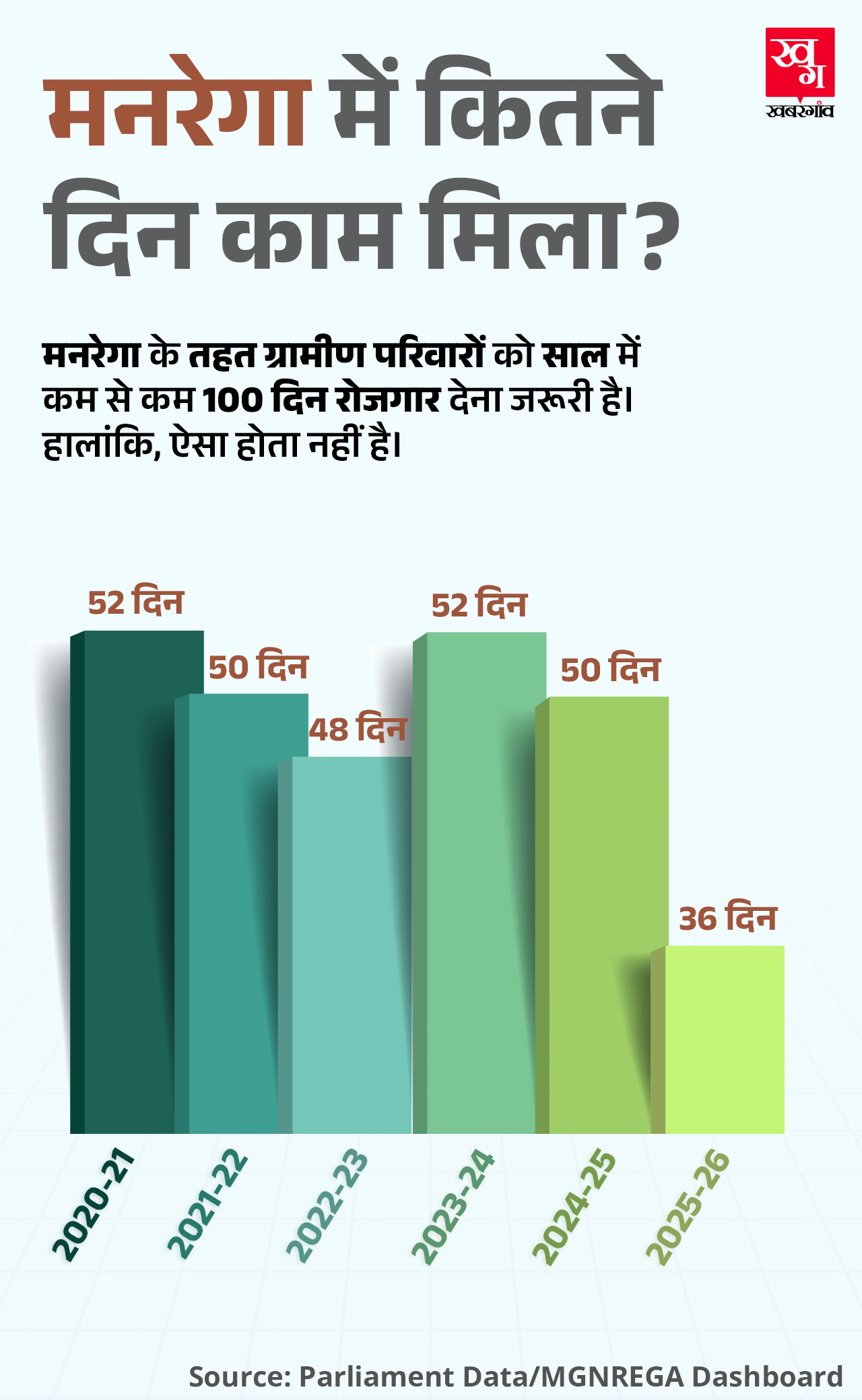 उन्होंने 2020-21 से 2024-25 के बीच 5 साल का आंकड़ा दिया था। इसके मुताबिक, 2024-25 में मनरेगा के तहत औसतन 50 दिन ही काम दिया गया था। वहीं, मनरेगा डैशबोर्ड पर मौजूद डेटा बताता है कि 2025-26 में इस योजना के तहत औसतन 36 दिन ही काम दिया गया है।