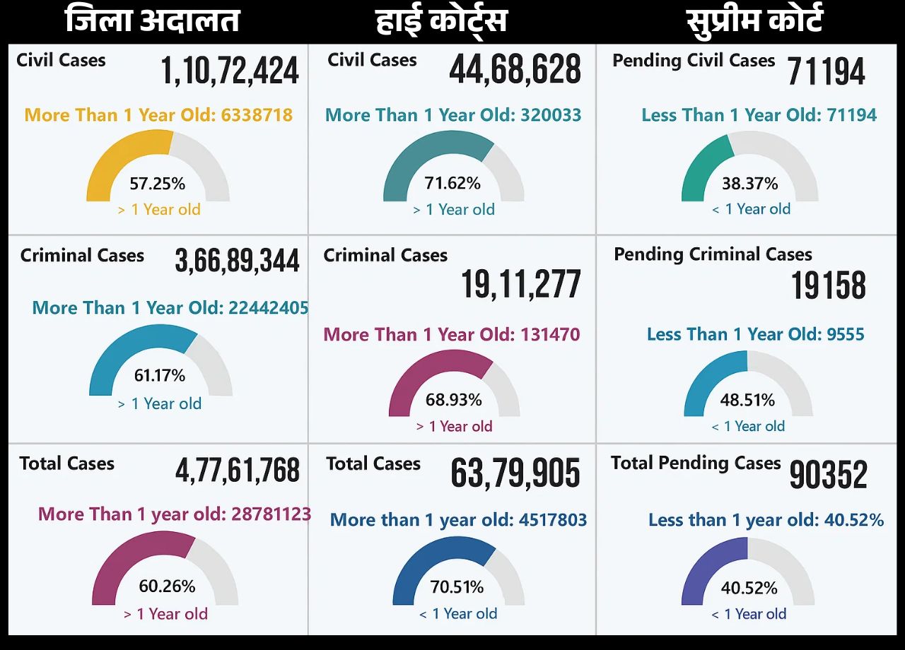 - सुप्रीम कोर्ट: डेटा बताता है कि सुप्रीम कोर्ट में आज की तारीख तक 90,352 मुकदमे लंबित हैं। इनमें 71,194 सिविल और 19,158 क्रिमिनल केस हैं। NJDG का डेटा दिखाता है कि सुप्रीम कोर्ट में 23 मामले तो ऐसे हैं जो 30 साल से ज्यादा समय से लंबित हैं। इनके अलावा 14,031 मामले 5 से 10 साल से पेंडिंग हैं।
