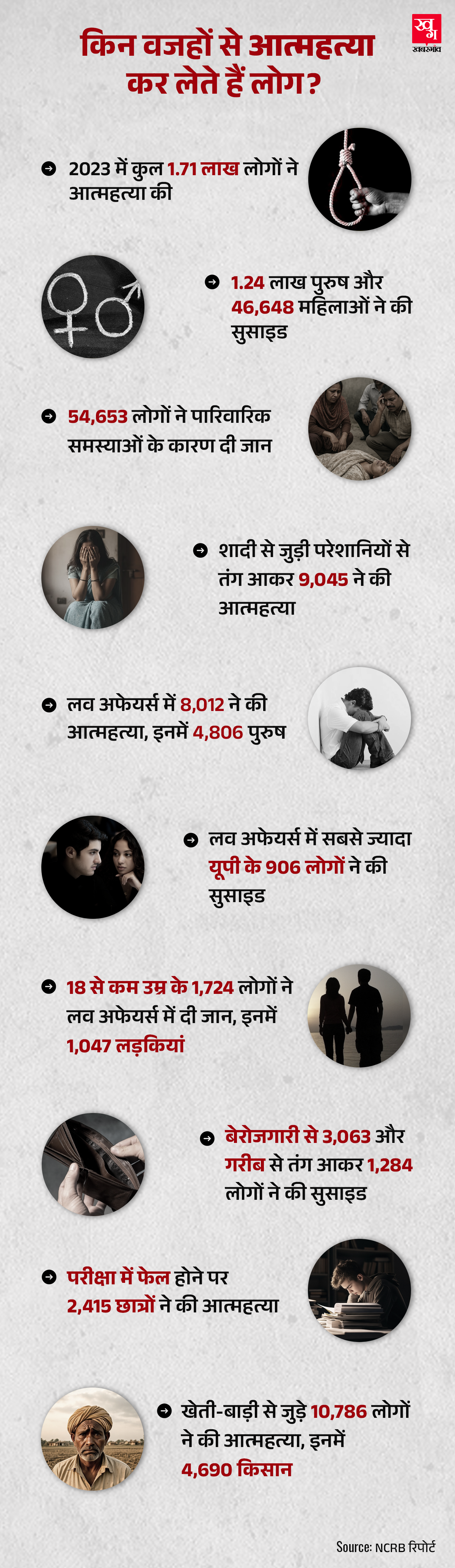 NCRB के डेटा के अनुसार, 2023 में कुल 1,71,418 लोगों ने आत्महत्या की है, जो 2022 से 494 ज्यादा हैं। 2023 में जितने लोगों आत्महत्या की थी, उनमें से 8 फीसदी से ज्यादा छात्र थे।