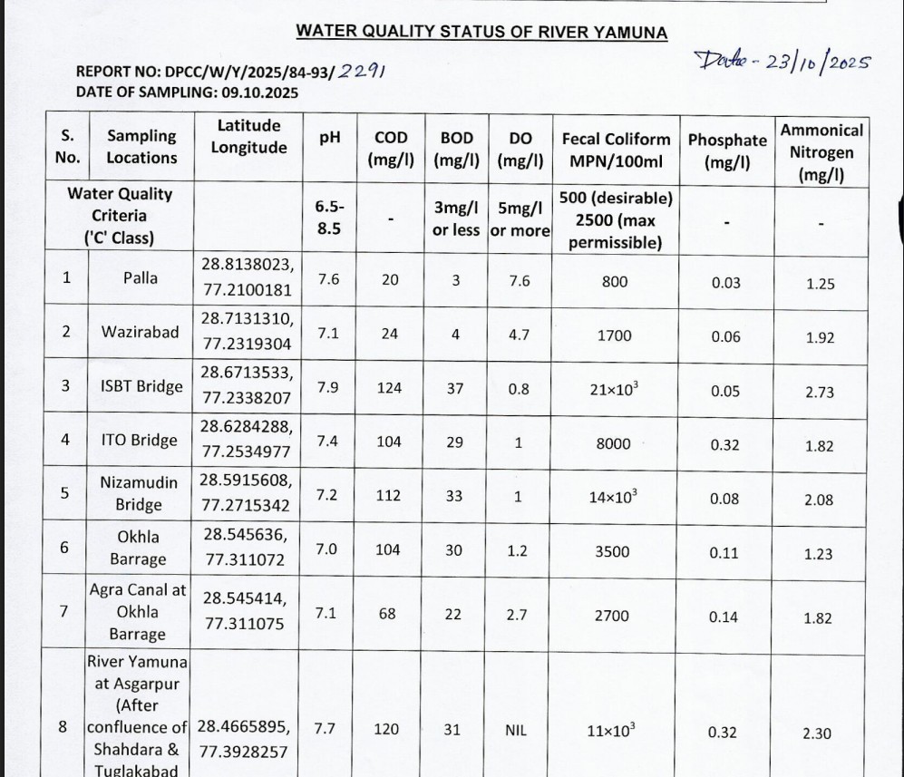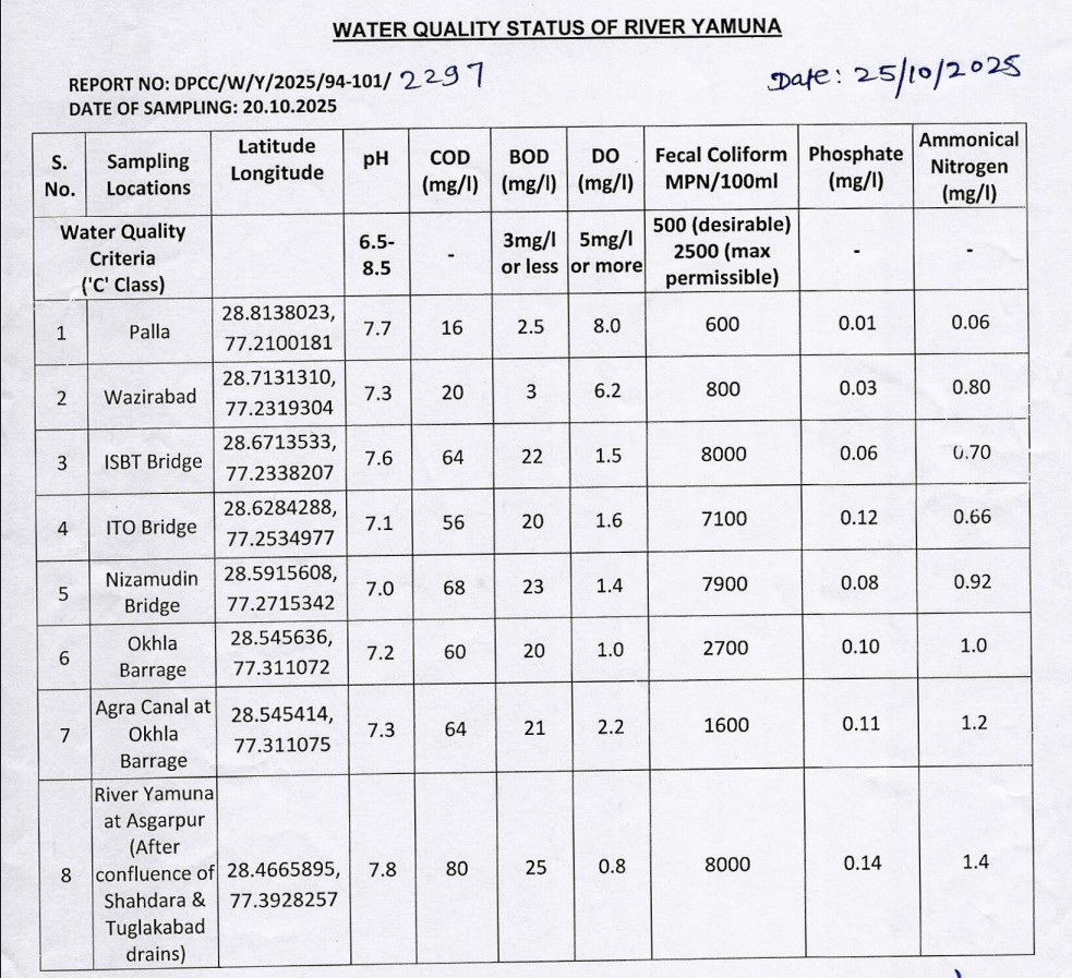 अब इस साल 23 अक्तूबर वाली रिपोर्ट की बात करते हैं। इस रिपोर्ट के लिए 9 अक्तूबर 2025 को सैंपल लिए गए। तब पल्ला में DO का स्तर 7.6 यानी मानक के हिसाब से ठीक था। वजीराबाद में यह 4.7 हुआ और ओखला बैराज पर 1.2 यानी मानक से काफी कम हो गया। इतने DO वाले पानी में जलीय जंतु जिंदा नहीं रह सकते। असगरपुर में यह मात्रा शून्य हो गई। इसी तरह फीकल कॉलीफॉर्म पल्ला में 800 था यानी दिल्ली तक आया पानी काफी हद तक साफ था। ISBT तक पहुंचते-पहुंचते यह मात्रा 21 हजार हुई, ओखला बैराज पर 3500 हुई और असगरपुर में 11000 हो गई। यानी पिछले साल की तुलना में पानी थोड़ा बहुत साफ हुआ लेकिन अभी भी यह पानी न तो नहाने लायक हुआ ना ही पीने के लायक।