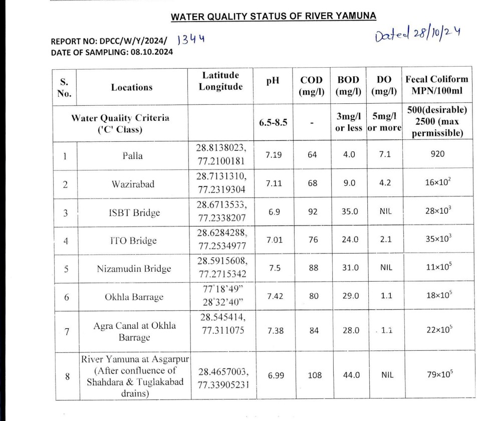 अक्तूबर 2024 में ओखला बैराज पर यमुना के पानी का pH 7.38 था जो कि मानक के मुताबिक ठीक है। अक्तूबर 2025 वाली रिपोर्ट में pH 7.1 था, यह भी मानक के मुताबिक सही है। डिजॉल्व्ड ऑक्सीजन यानी पानी में ऑक्सीजन की मात्रा 5 मिलीग्रीम या उससे ज्यादा होनी चाहिए। 28 अक्तूबर 2024 को जारी रिपोर्ट के मुताबिक, दिल्ली में प्रवेश करते समय यानी पल्ला में यमुना में DO का स्तर 7.1 था यानी पानी मानक के हिसाब से सही था लेकिन ओखला बैराज पहुंचते-पहुंचते यह 1.1 हो गया। तब फीकल कॉलीफॉर्म यानी पानी में मल वाले बैक्टीरिया की मात्रा पिछले साल 2.2 लाख/100 मिली लीटर से ज्यादा थी जबकि इसकी अधिकतम मात्रा 2500 से ज्यादा नहीं होनी चाहिए। यानी पिछले साल अक्तूबर में यमुना का पानी न तो पीने लायक था और ना ही नहाने के लायक।