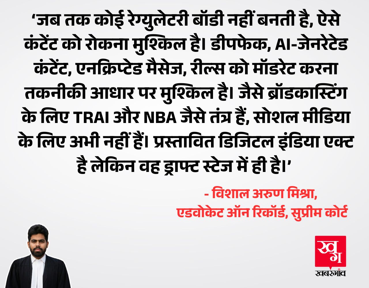 सुप्रीम कोर्ट में एडवोकेट ऑन रिकॉर्ड विशाल अरुण मिश्रा ने कहा, 'जब तक कोई रेग्युलेटरी बॉडी नहीं बनती है, ऐसे कॉन्टेंट को रोकना मुश्किल है। डीपफेक, AI-जेनरेटेड कॉन्टेंट, एनक्रिप्टेड मैसेज, रील्स को मॉडरेट करना तकनीकी आधार पर मुश्किल है। जैसे ब्रॉडकास्टिंग के लिए टेलीकॉम रेग्युलेटरी अथॉरिटी ऑफ इंडिया (TRAI) और नेशनल बोर्ड ऑफ एक्रिडिटेशन (NBA) जैसे तंत्र हैं, सोशल मीडिया के लिए अभी नहीं हैं। प्रस्तावित डिजिटल इंडिया एक्ट है लेकिन वह ड्राफ्ट स्टेज में ही है लेकिन ठंडे बस्ते में पड़ा है। जब तक एक रेग्युलेटरी बॉडी नहीं मिलती है, सोशल मीडिया को रेग्युलेट करना मुश्किल है।'