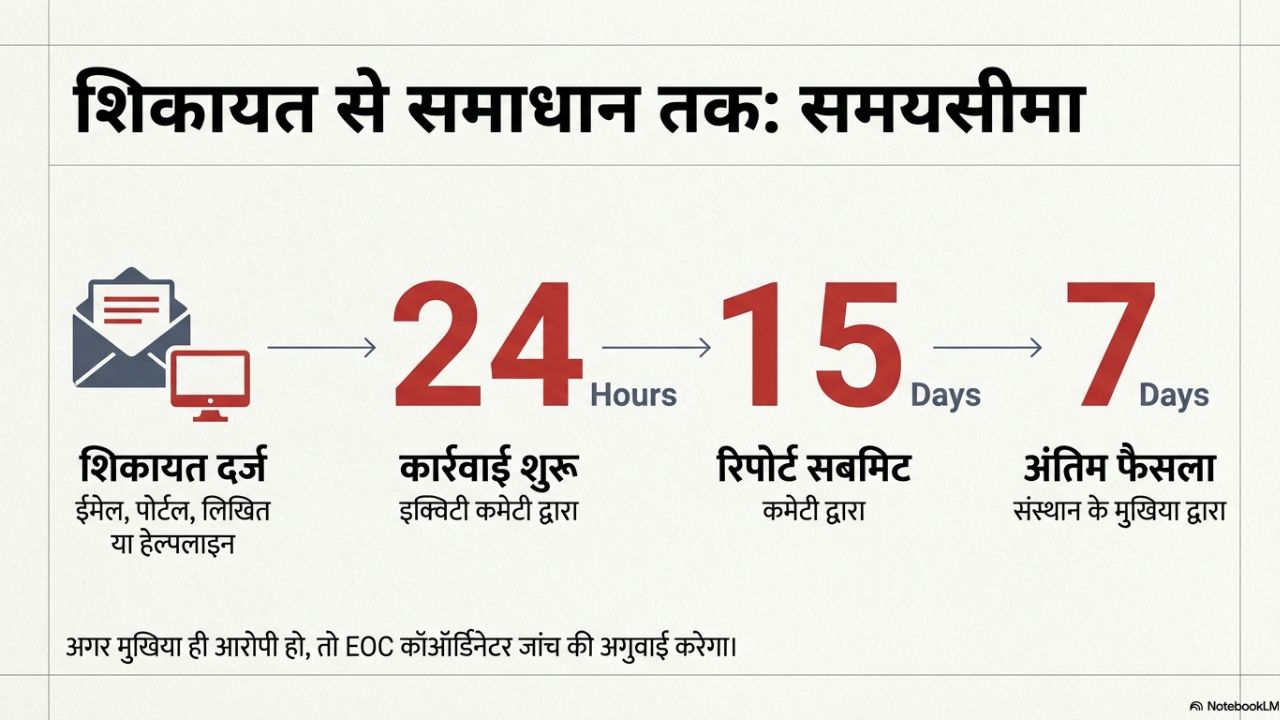 नए नियमों के मुताबिक, अगर कोई शिकायत आती है तो उसका समाधान निश्चित समयसीमा में करना होगा। पीड़ित शख्स ईमेल, ऑनलाइन पोर्टल, लिखित शिकायत या हेल्पलाइन के जरिए अपनी शिकायत दर्ज करा सकेगा और इक्विटी कमेटी को 24 घंटे में इस पर कार्रवाई करनी होगी। कमेटी 15 दिन में अपनी रिपोर्ट सबमिट करेगी। रिपोर्ट के बाद संस्थान के मुखिया के पास कार्रवाई करने के लिए 7 दिन का समय होगा। अगर संस्थान के मुखिया ही पीड़ित या शिकायतकर्ता हों तो EOC के कोऑर्डिनेटर इस जांच की अगुवाई करेंगे।