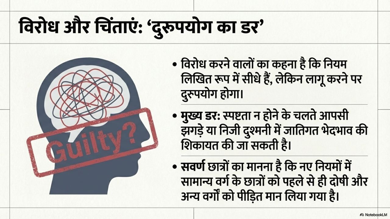इन नियमों को लेकर कई चिंताएं सामने आ रही हैं और ऐसी चिंताओं की बड़ी वजह है कई चीजों पर स्पष्टता नहीं है। गलत और फर्जी शिकायतों की स्थिति में क्या होगा, आपसी झगड़ों के बाद किसी ने शिकायत कर दी तो क्या होगा और किसी ने दुश्मनी निकालने के लिए जातिगत भेदभाव से जुड़ी शिकायत की गई तो क्या होगा? विरोध कर रहे लोगों का कहना है कि स्पष्टता न होने के चलते इसका दुरुपयोग किया जा सकता है।
