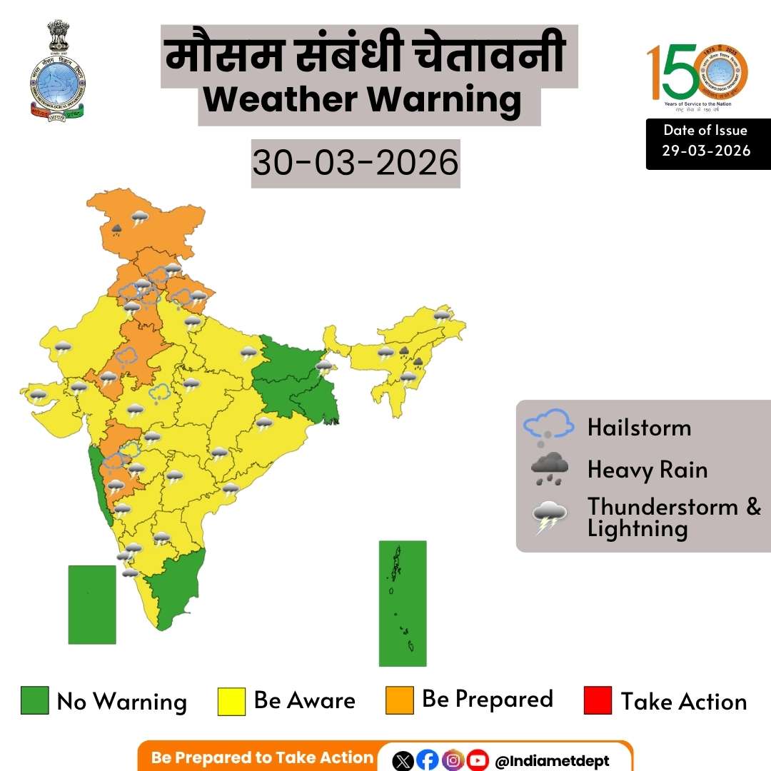 मौसम विभाग के अनुसार, मुताबिक 30 मार्च को हिमाचल प्रदेश, पंजाब और पूर्वी राजस्थान में भारी बारिश की संभावना है, इसके साथ ही 60 किलोमीटर प्रति घंटे की रफ्तार से तेज हवा के झोंके चलेंगे। इसको लेकर मौसम विभाग ने पंजाब के पठानकोट, अमृतसर, लुधियाना, होशियारपुर, कपूरथला, गुरदासपुर, जालंधर और फिरोजपुर जिलों में तेज बारिश के साथ आंधी का अलर्ट जारी किया गया है।