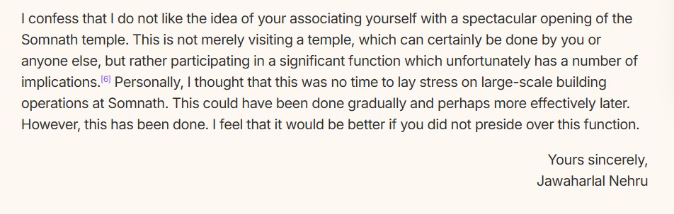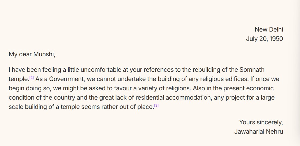 "प्रिय मुंशी, सोमनाथ मंदिर के फिर से निर्माण में आपकी संलिप्तता से मैं सहज नहीं हूं। सरकार के तौर पर हम किसी धर्म स्थल के निर्माण का काम नहीं कर सकते हैं। अगर हम एक बार ऐसा करते हैं तो हमसे अलग-अलग धर्मों के लिए ऐसा ही करने की मांग की जाएगी। देश की मौजूदा आर्थिक स्थिति के हिसाब से ऐसे प्रोजेक्ट ठीक भी नहीं हैं।"