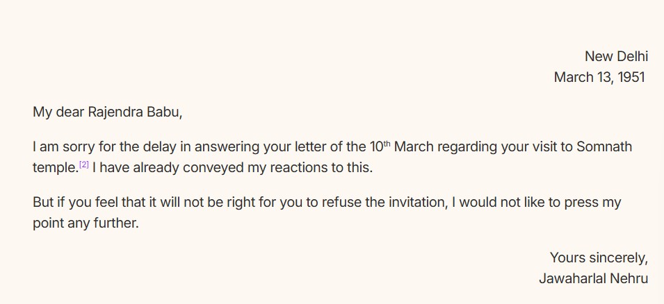 "प्रिय राजेंद्र बाबू, 2 मार्च को लिखी आपकी चिट्ठी के लिए शुक्रिया। पिछले कुछ दिनों से मैं आपसे बात नहीं कर पा रहा हूं इसके लिए माफी चाहता हूं। मैं आपसे यह कहना चाहता हूं कि सोमनाथ मंदिर के कार्यक्रम में आपके जाने को लेकर मैं खुश नहीं हूं। यह सिर्फ एक मंदिर जाना भर नहीं है, यह एक ऐसे भव्य कार्यक्रम में शामिल होना है जिसके जाहिर तौर पर कई तरह के असर होंगे। व्यक्तिगत तौर पर मेरा मानना है कि यह ऐसा वक्त नहीं है कि सोमनाथ मंदिर का ऐसा भव्य निर्माण किया जाए। यह काम धीरे-धीरे और शायद और प्रभावी ढंग से आने वाले सालों में किया जा सकता है। हालांकि, अब यह हो ही गया है तो मेरा मानना है कि अगर आप इस कार्यक्रम की अध्यक्षता न करें तो बेहतर होगा।"