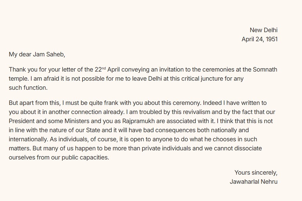 "प्रिय जाम साहब, आपने सोमनाथ मंदिर के कार्यक्रम में शामिल होने के न्योते वाली जो चिट्ठी 22 अप्रैल को लिखी है उसके लिए शुक्रिया है। हालांकि, मेरे लिए इस संवेदनशील स्थिति में किसी भी कार्यक्रम के लिए दिल्ली छोड़ना संभव नहीं है। इसके इतर इस कार्यक्रम के बारे में मैं आपके सामने अपनी स्पष्ट राय भी रखना चाहूंगा। मैं पहले भी आपको इस बारे में लिख चुका हूं। मुझे इस तरह के नवजागरणवाद और इस तथ्य से बहुत परेशानी है कि हमारे राष्ट्रपति, कुछ मंत्री और राजप्रमुख के रूप में आप इस कार्यक्रम से जुड़े हुए हैं। मेरी राय में यह राज्य के नेचर के हिसाब से सही नहीं है और राष्ट्रीय और अंतरराष्ट्रीय स्तर पर इसके परिणाम बुरे होंगे। व्यक्तिगत तौर पर तो हर किसी को ऐसे मामले में अपनी-अपनी आजादी है ही लेकिन हम में से बहुत सारे लोग सिर्फ एक व्यक्ति नहीं हैं और हम अपने जन प्रतिनिधित्व को इससे अलग नहीं कर सकते हैं।"