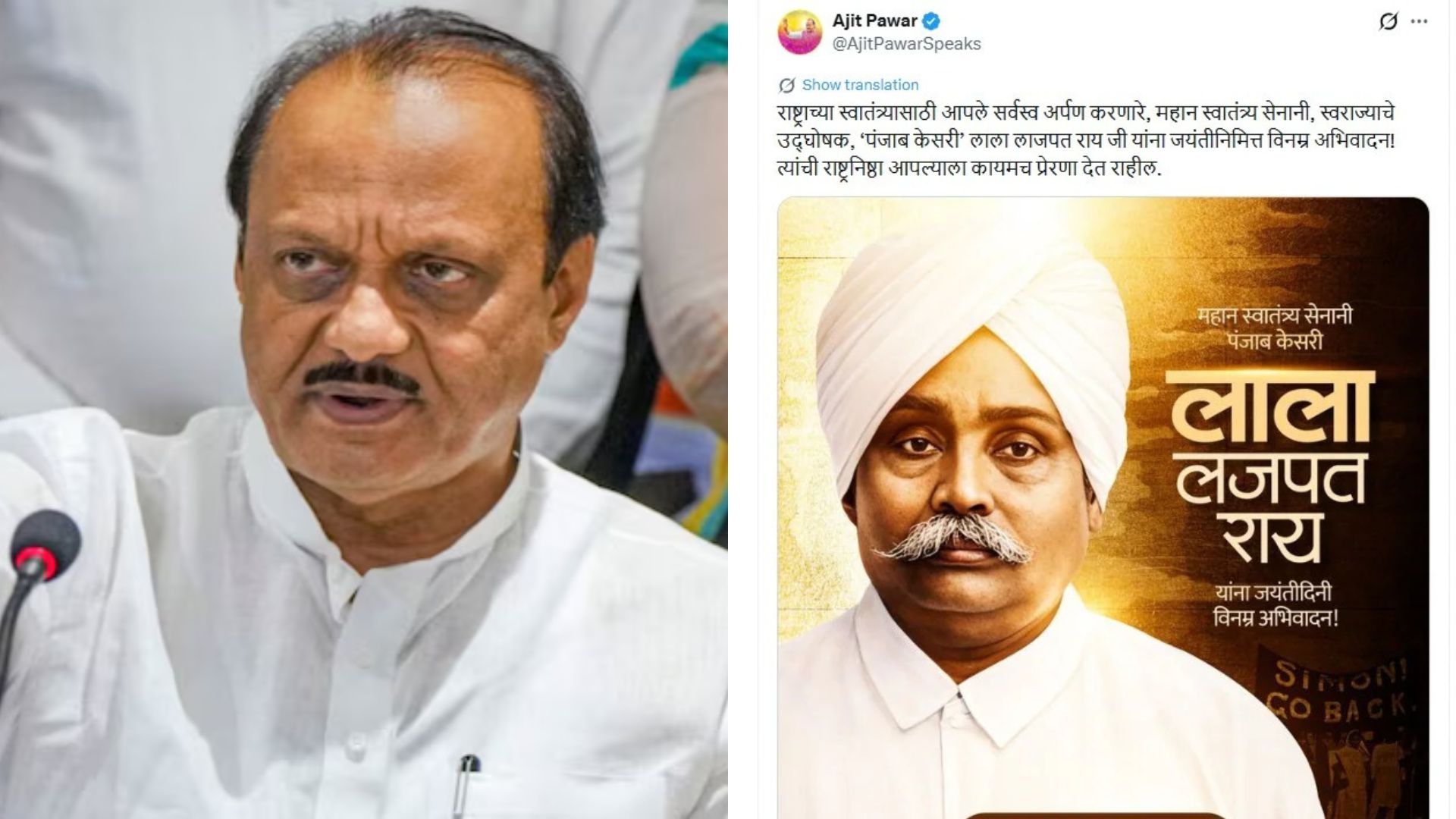 महाराष्ट्र के उपमुख्यमंत्री अजीत पवार ने 28 जनवरी 2026 को सुबह करीब 8:57 बजे X पर लाला लाजपत राय को याद करते हुए एक भावुक पोस्ट शेयर की। यह पोस्ट प्लेन क्रैश से लगभग आधे घंटे पहले की थी, जब वे बारामती जा रहे थे। पोस्ट में उन्होंने लाला लाजपत राय को 'पंजाब के शेर' कहकर श्रद्धांजलि दी, जिसमें उनकी ही कही बात लिखी थी, 'जो वार मुझ पर किए गए हैं, वे भारत में ब्रिटिश शासन के ताबूत की आखिरी कील साबित होंगे।'