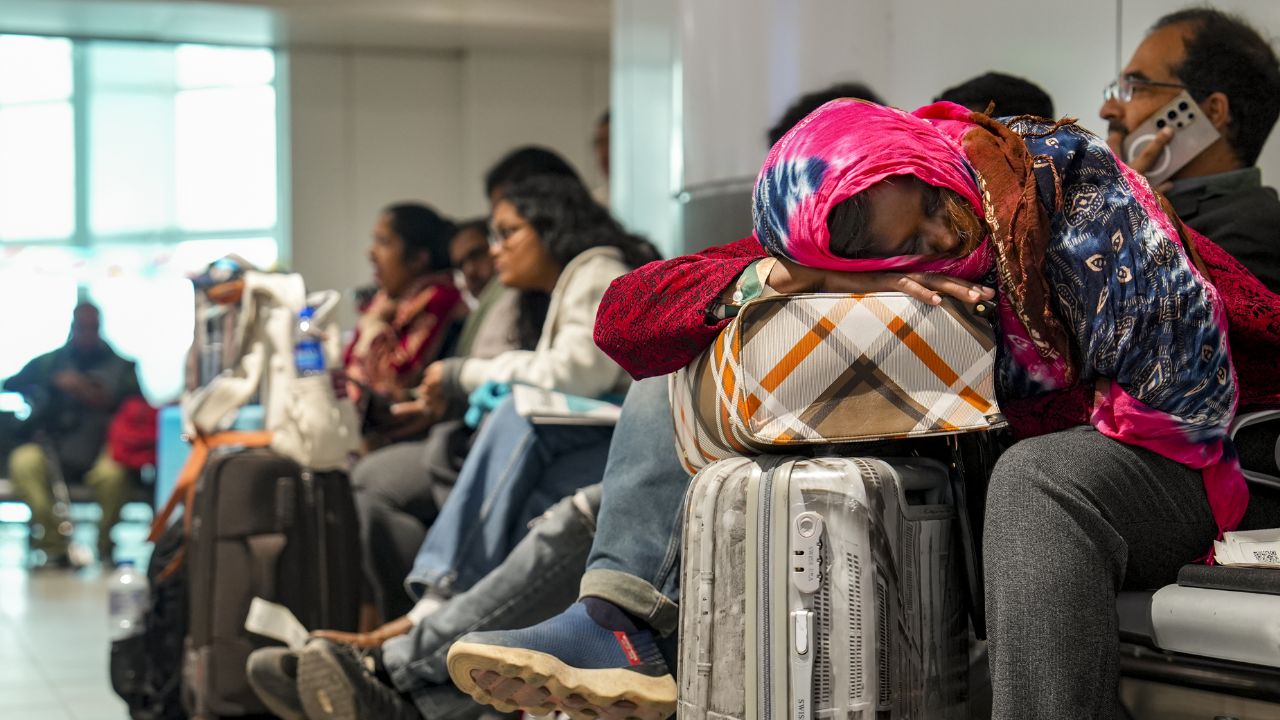 इंडिगो की फ्लाट कैंसिल होने के बाद एयरपोर्ट पर बैठे यात्री। (Photo Credit: PTI)