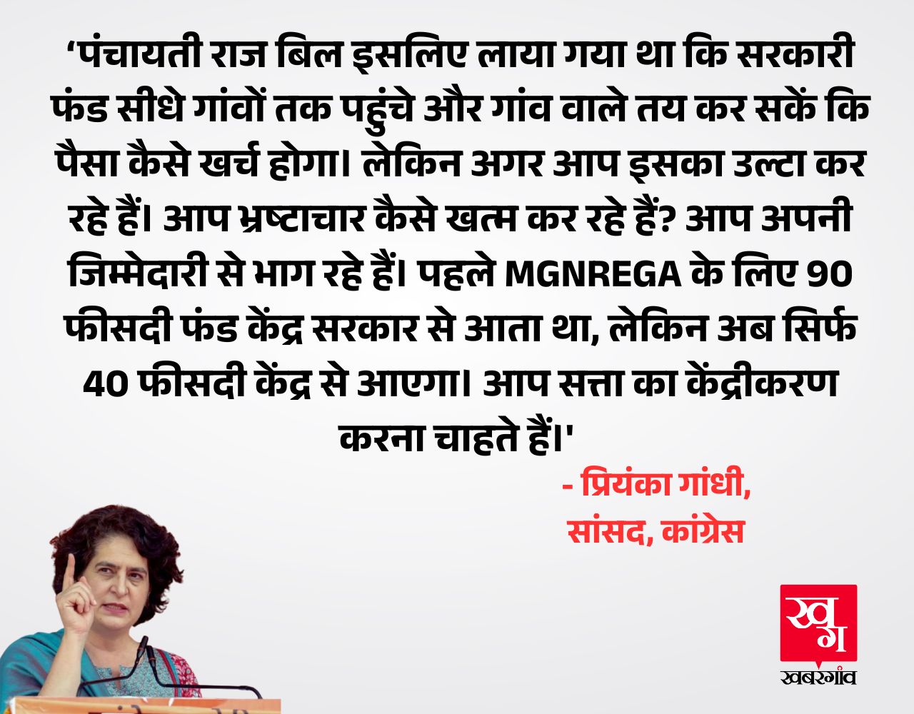 प्रियंका गांधी ने कहा, 'नए विधेयक से रोजगार का कानूनी अधिकार कमजोर हो रहा है। विधेयक में केंद्र के अनुदान को 90 से 60 प्रतिशत किया गया है और राज्यों पर अतिरिक्त भार पड़ेगा। विधेयक वापस लिया जाना चाहिए या कम से कम स्थायी समिति के पास भेजा जाए। किसी की निजी महत्वाकांक्षा, सनक और पूर्वाग्रह के आधार पर कोई विधेयक पेश नहीं होना चाहिए।