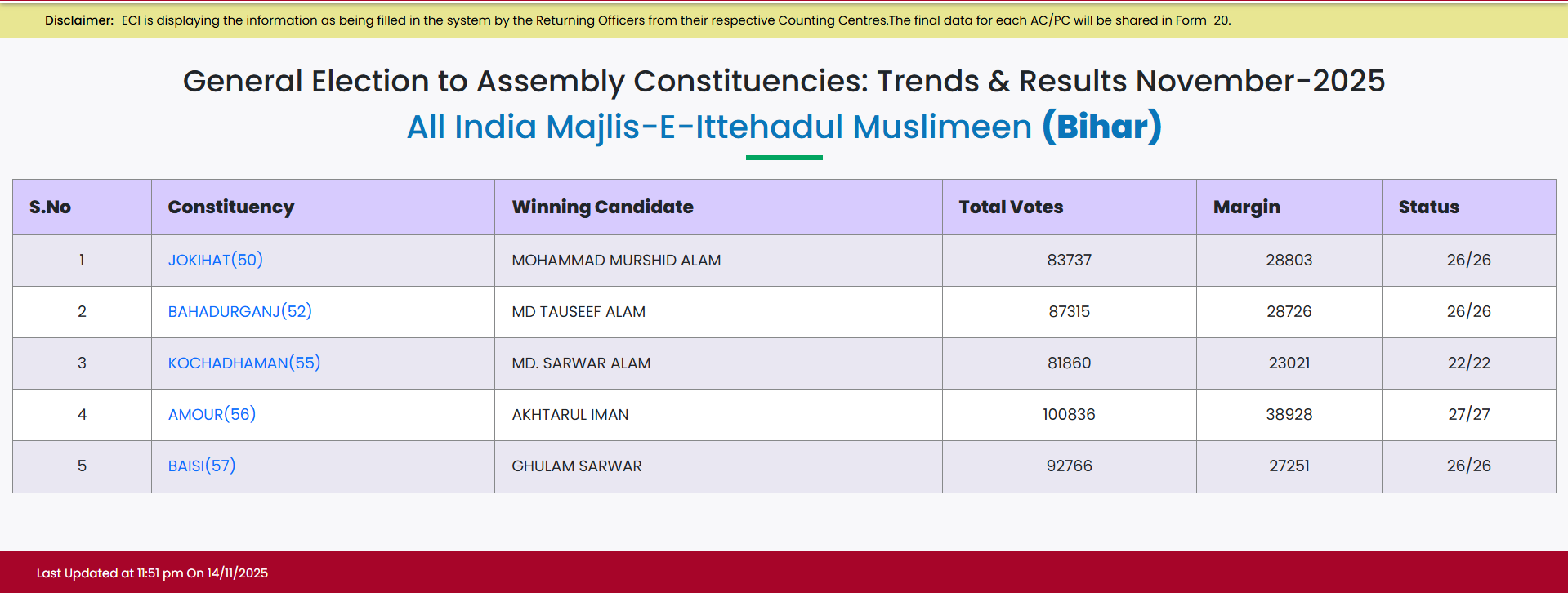 कोचाधामन- इस सीट पर AIMIM के सरवर आलम ने 81,860 वोट हासिल करते हुए 23,021 वोटों से चुनाव जीत लिया।