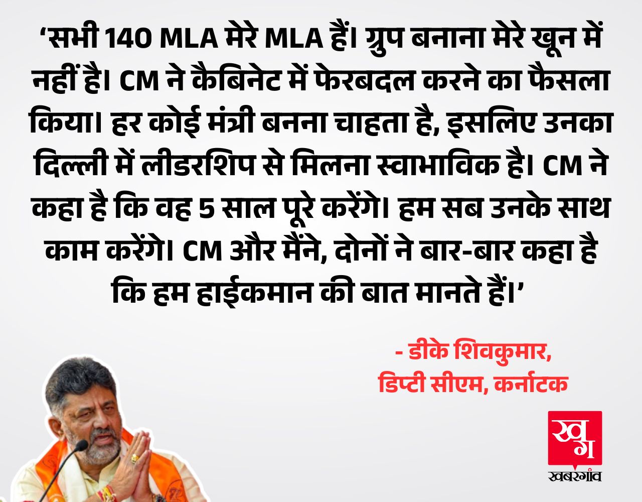 डीके शिवकुमार ने महाराष्ट्र में सत्ता परिवर्तन की खबरों को एक सिरे से नकार दिया है। उन्होंने कहा है कि कर्नाटक कांग्रेस के सभी 140 विधायक, उनके हैं। वे गुटबाजी में भरोसा नहीं करते हैं। हर कोई मत्री बनना चाहता है, इसलिए कुछ विधायकों ने आलाकमान से मिलने के लिए दिल्ली का रुख किया है। यह उनका अधिकार है, उन्हें रोका नहीं जा सकता है।