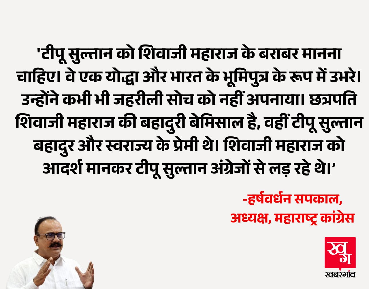 त्रपति शिवाजी महाराज की बहादुरी बेमिसाल है, जबकि टीपू सुल्तान स्वराज्य के प्रेमी थे। छत्रपति शिवाजी महाराज को आदर्श मानकर ही उन्होंने अंग्रेजों के खिलाफ लड़ाई लड़ी। जब टीपू सुल्तान विदेशी शासकों से लड़ रहे थे, तब संघ-BJP की विचारधारा को मानने वाले लोग अंग्रेजों के गुलाम और जासूस थे। देवेंद्र फडणवीस को हमें इतिहास पढ़ाने का दिखावा नहीं करना चाहिए। महाराष्ट्र के लोग यह नहीं भूले हैं कि BJP-RSS, भगतसिंह कोश्यारी और दूसरों ने छत्रपति शिवाजी महाराज के खिलाफ क्या-क्या कहा और उनका अपमान किया।