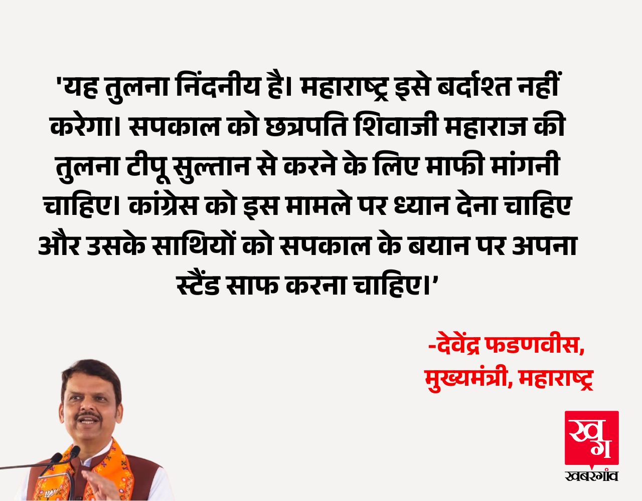 महाराष्ट्र अध्यक्ष हर्षवर्धन सपकाल के बयान पर मुख्यमंत्री देवेंद्र फडणवीस ने लिखा, 'यह तुलना निंदनीय है। महाराष्ट्र इसे बर्दाश्त नहीं करेगा। सपकाल को छत्रपति शिवाजी महाराज की तुलना टीपू सुल्तान से करने के लिए माफी मांगनी चाहिए। कांग्रेस को इस मामले पर ध्यान देना चाहिए और उसके साथियों को सपकाल के बयान पर अपना स्टैंड साफ करना चाहिए।