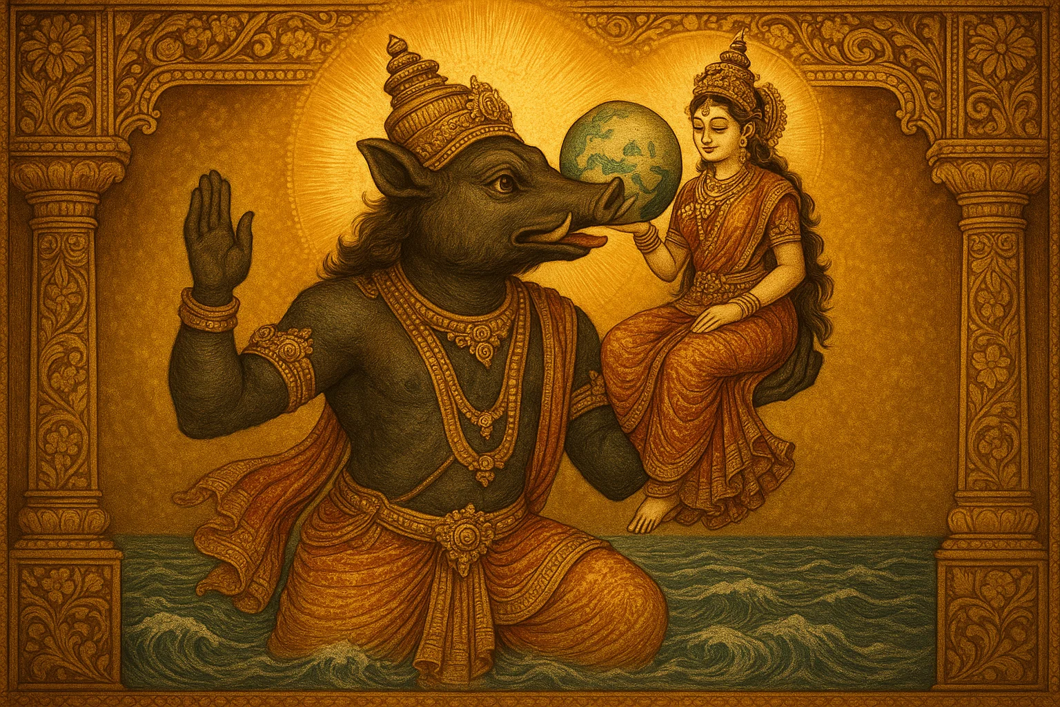 दैत्य हिरण्याक्ष ने पृथ्वी को समुद्र में छिपा दिया था। तब विष्णु वराह रूप में प्रकट हुए और पृथ्वी को अपने दांतों पर उठाकर सुरक्षित किया। युद्ध में उन्होंने हिरण्याक्ष का वध किया और पृथ्वी को जल पर स्थापित किया।