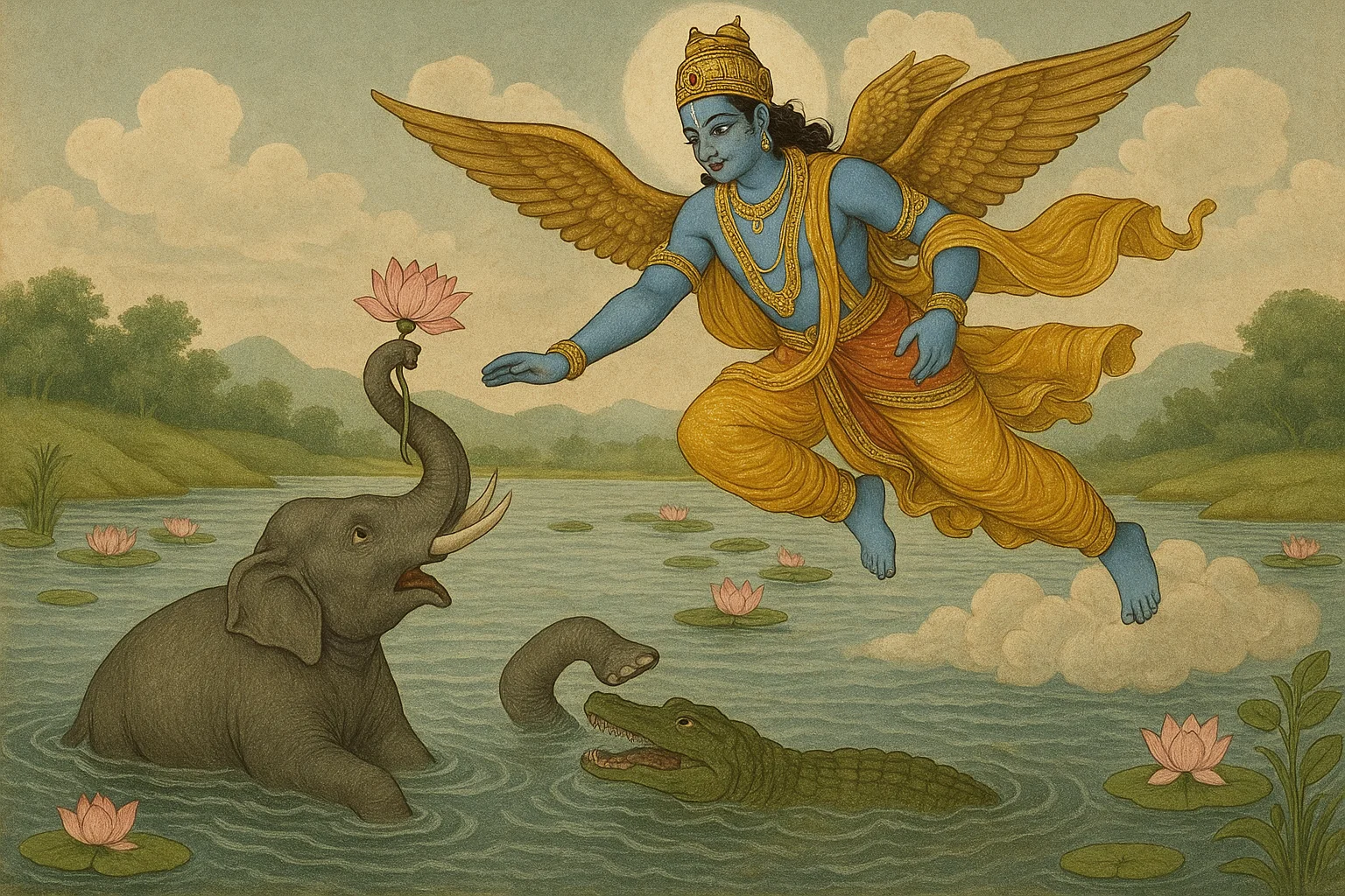 गजेंद्र को मगरमच्छ से मुक्त करने और भक्ति का महत्व दिखाने के लिए प्रकट हुए।