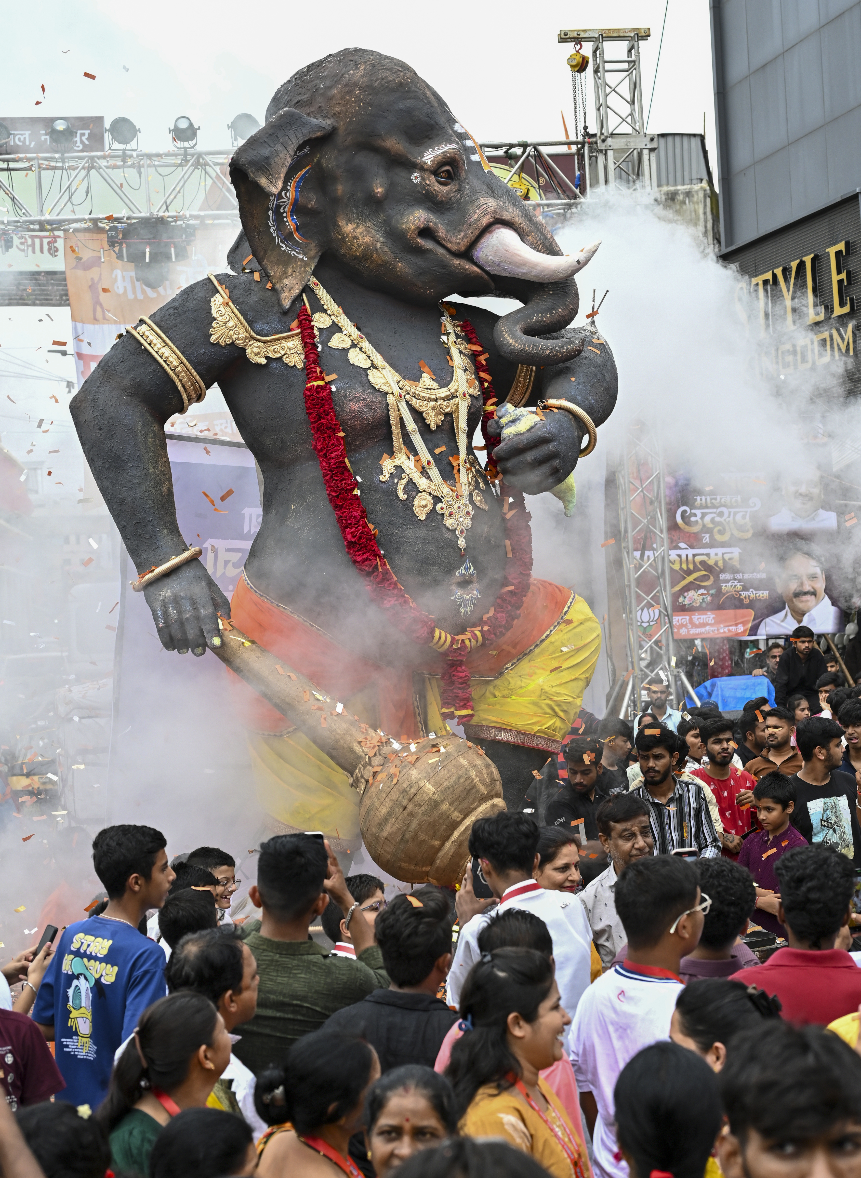 नागपुर में गणेश चतुर्थी के मौके पर भगवान गणेश की प्रतिमा को अलग तरीके से सजाया गया है। इस प्रतिमा की खासियत यह है कि भगवान गणेश को यहां बहुत ही विशाल और अद्वितीय रूप में सजाया गया है। प्रतिमा का रंग गहरे काले शिल्प जैसा है, जो इसे और भी दिव्य और प्रभावशाली बनाता है।