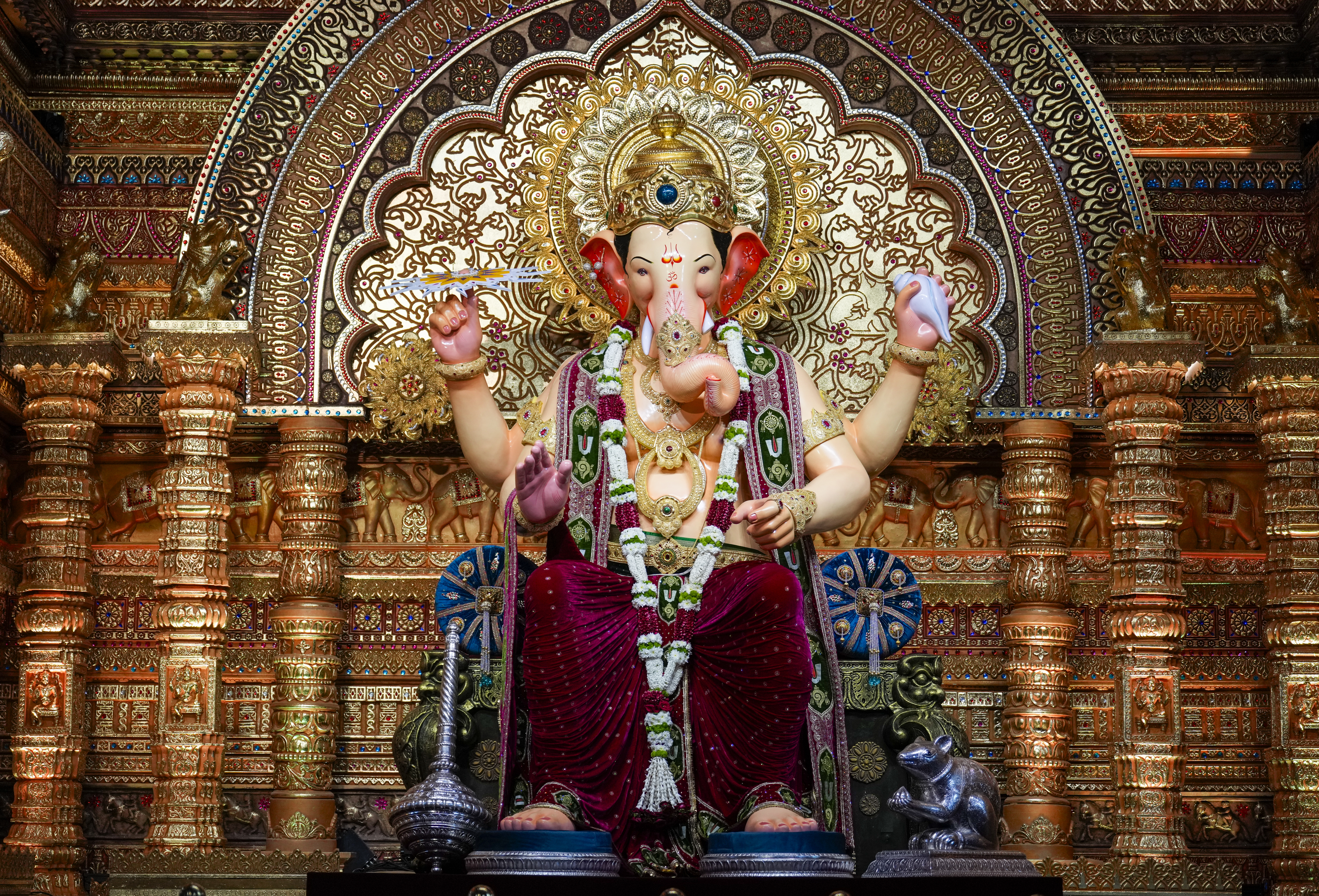 मूर्ति के पीछे का सिंहासन और पृष्ठभूमि पूरी तरह से सुनहरी शिल्पकारी से सजाया गया है, जिसमें हाथियों और पारंपरिक आकृतियों की नक्काशी की गई है। यह भव्यता दर्शाती है कि लालबागचा राजा केवल श्रद्धा का केंद्र नहीं बल्कि कला, संस्कृति और परंपरा का अद्भुत संगम है।